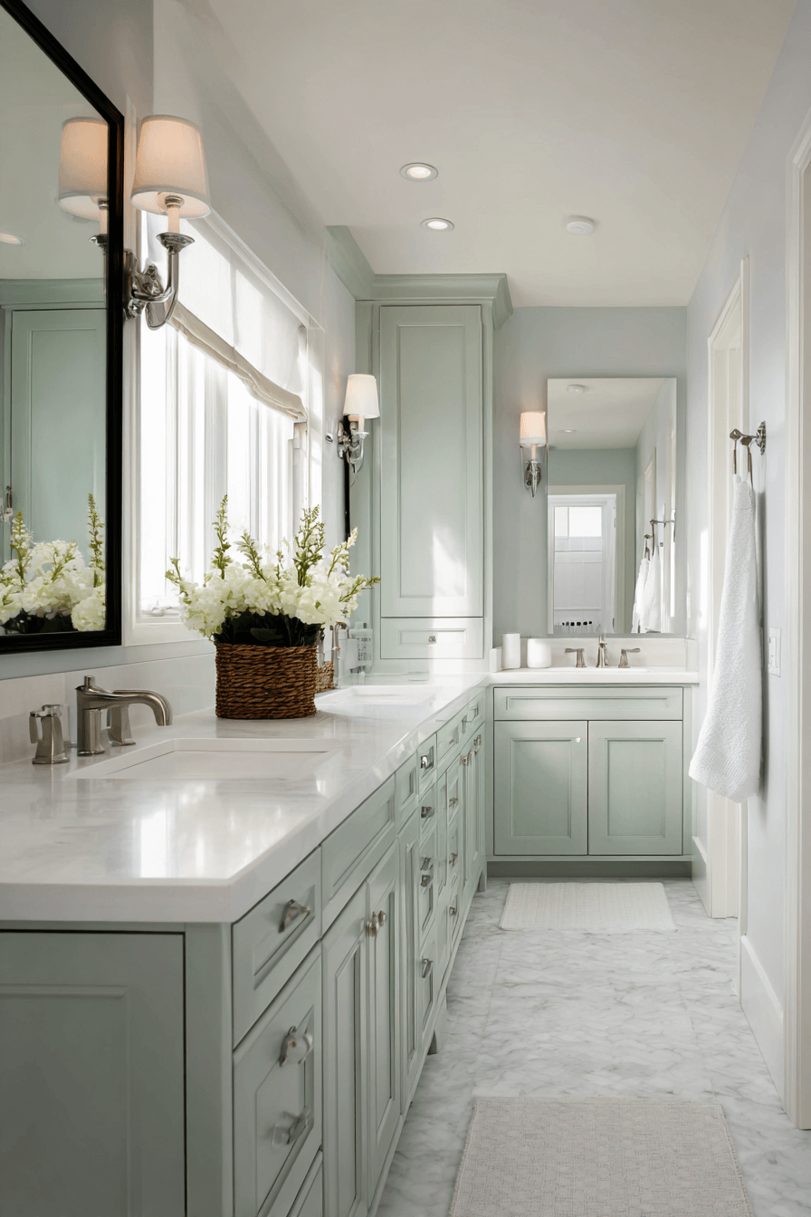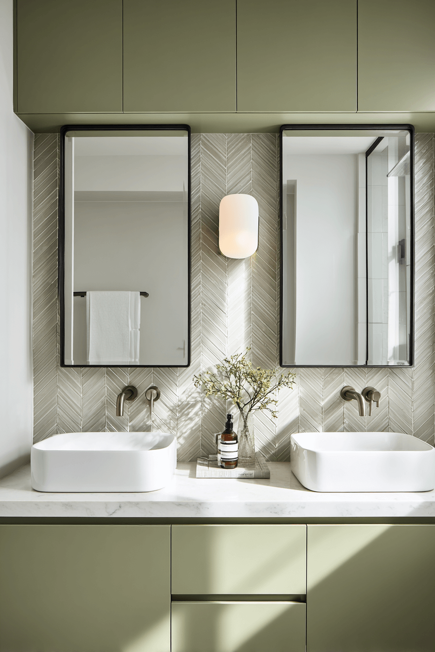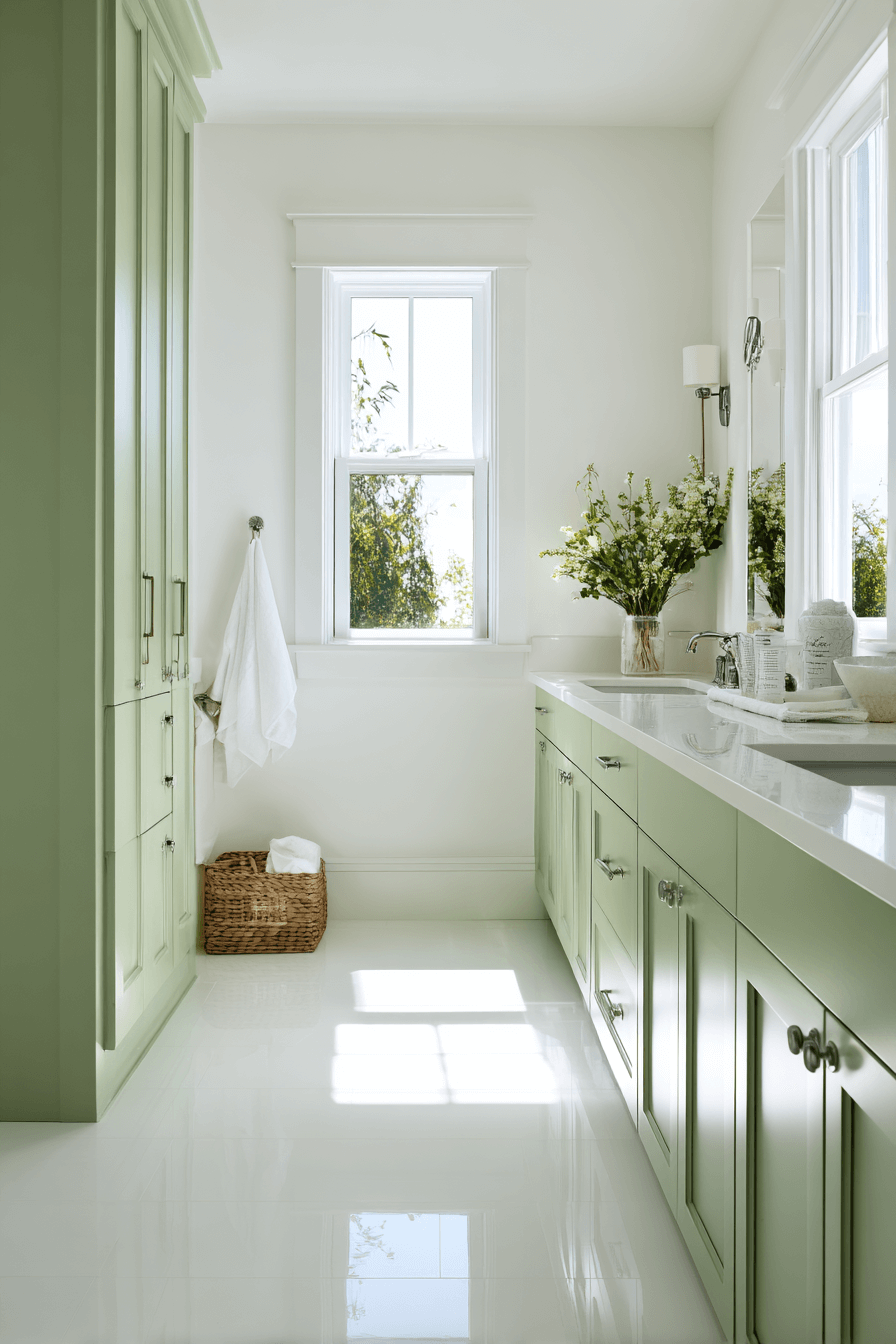 Architectural details stand out in this crisp combination. A sage green and white bathroom highlights clean lines because white defines structure and sage softens edges. Flat-panel cabinetry and geometric mirrors feel strong yet warm. The design reads modern but never harsh. It’s structured without feeling cold. Click to achieve this sleek architectural finish!