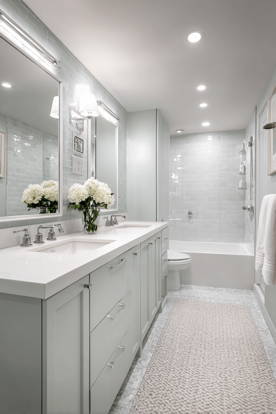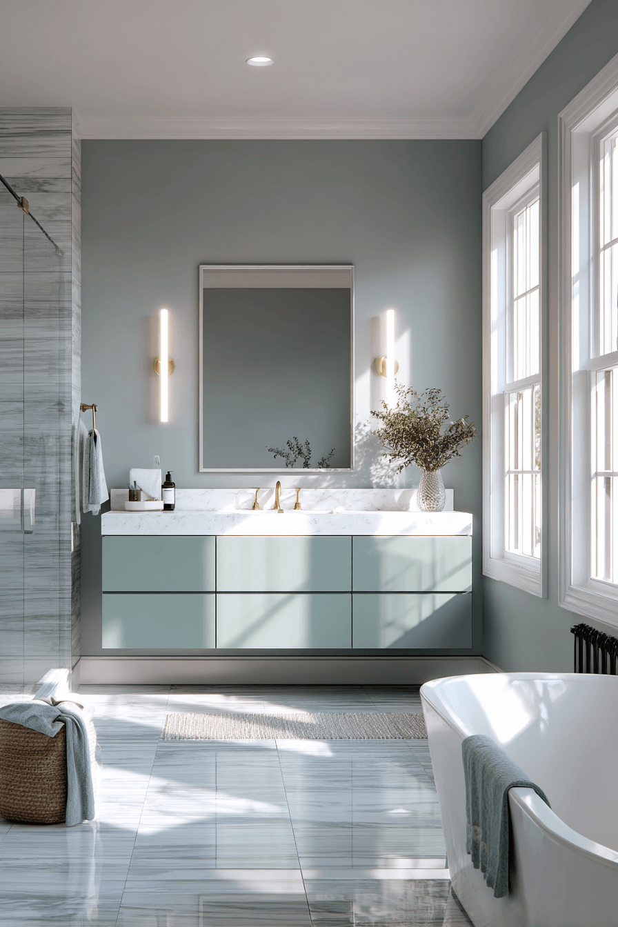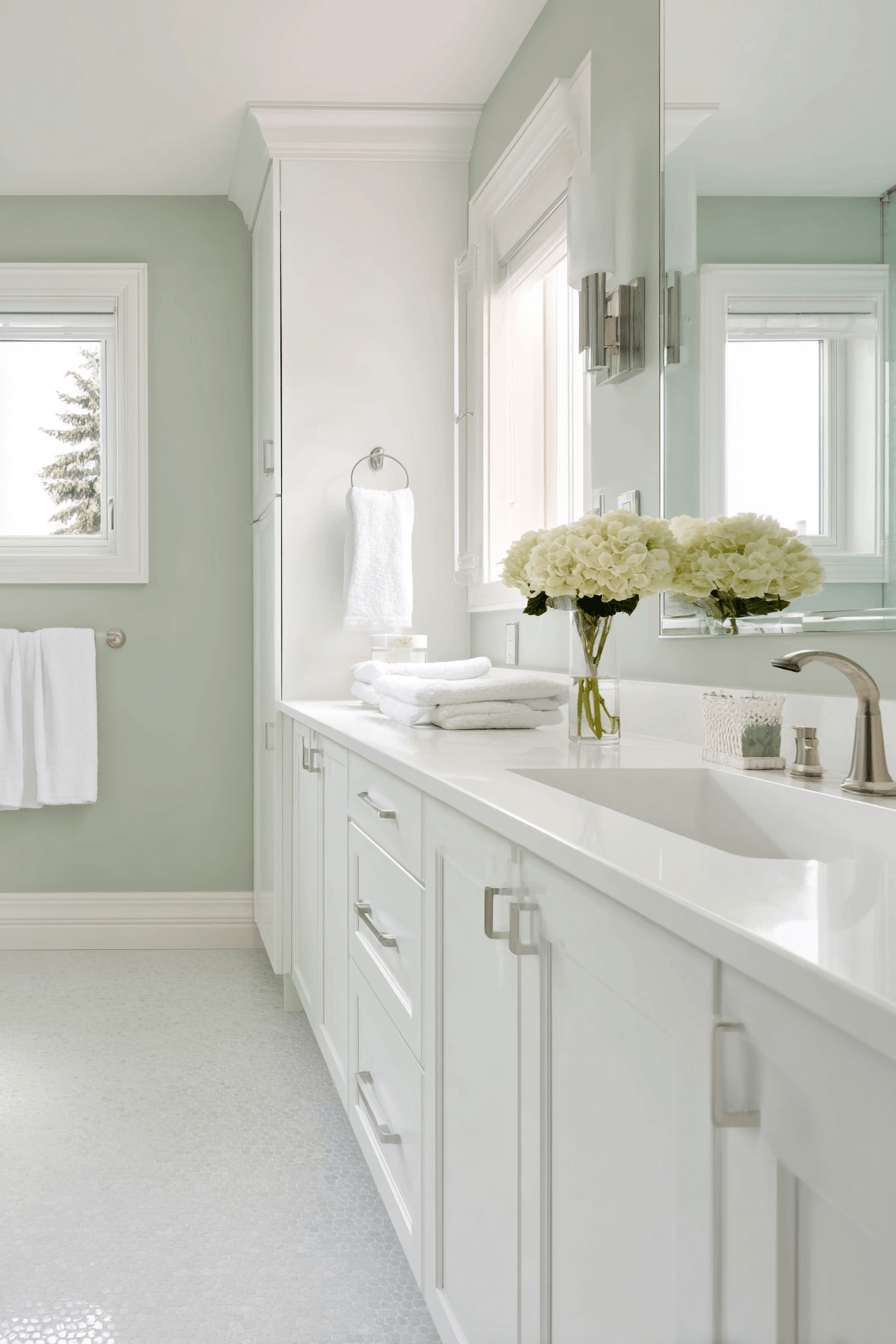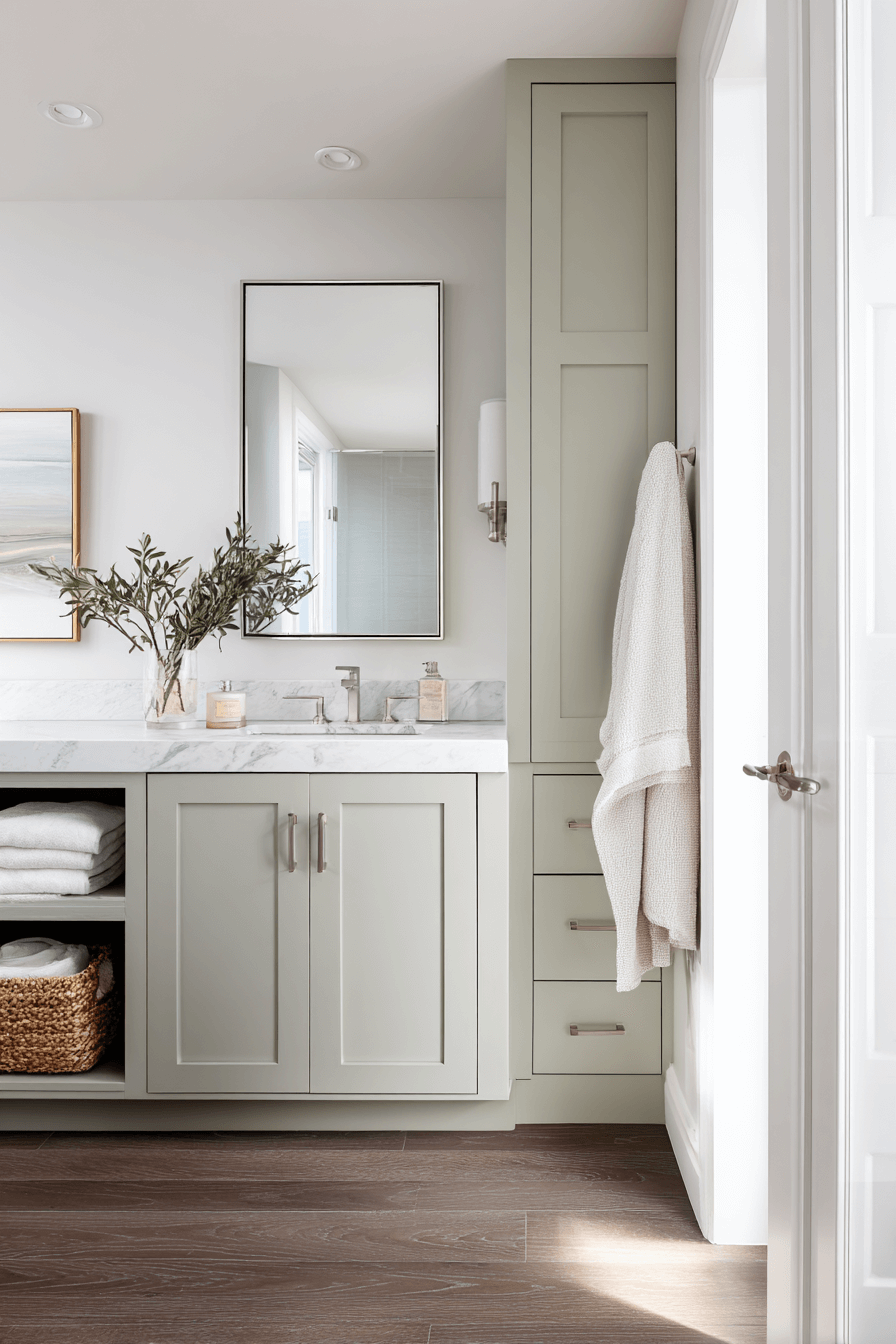 Architectural details stand out in this crisp combination. A sage green and white bathroom highlights clean lines because white defines structure and sage softens edges. Flat-panel cabinetry and geometric mirrors feel strong yet warm. The design reads modern but never harsh. It’s structured without feeling cold. Click to achieve this sleek architectural finish!