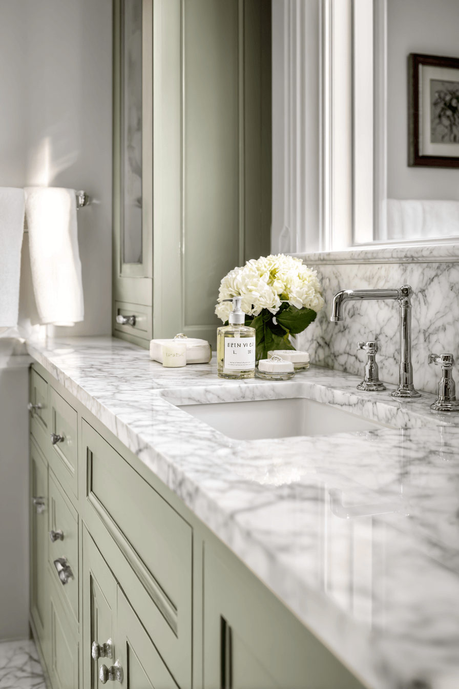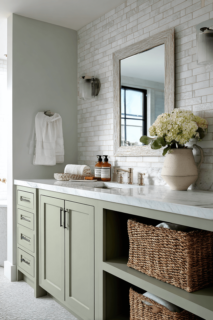Marble elevates this palette instantly. A sage green and white bathroom paired with marble surfaces feels polished and timeless. The veining adds subtle movement while sage cabinetry introduces warmth. White enhances brightness and sophistication. The overall look feels refined yet livable. Tap to bring marble-inspired elegance home!