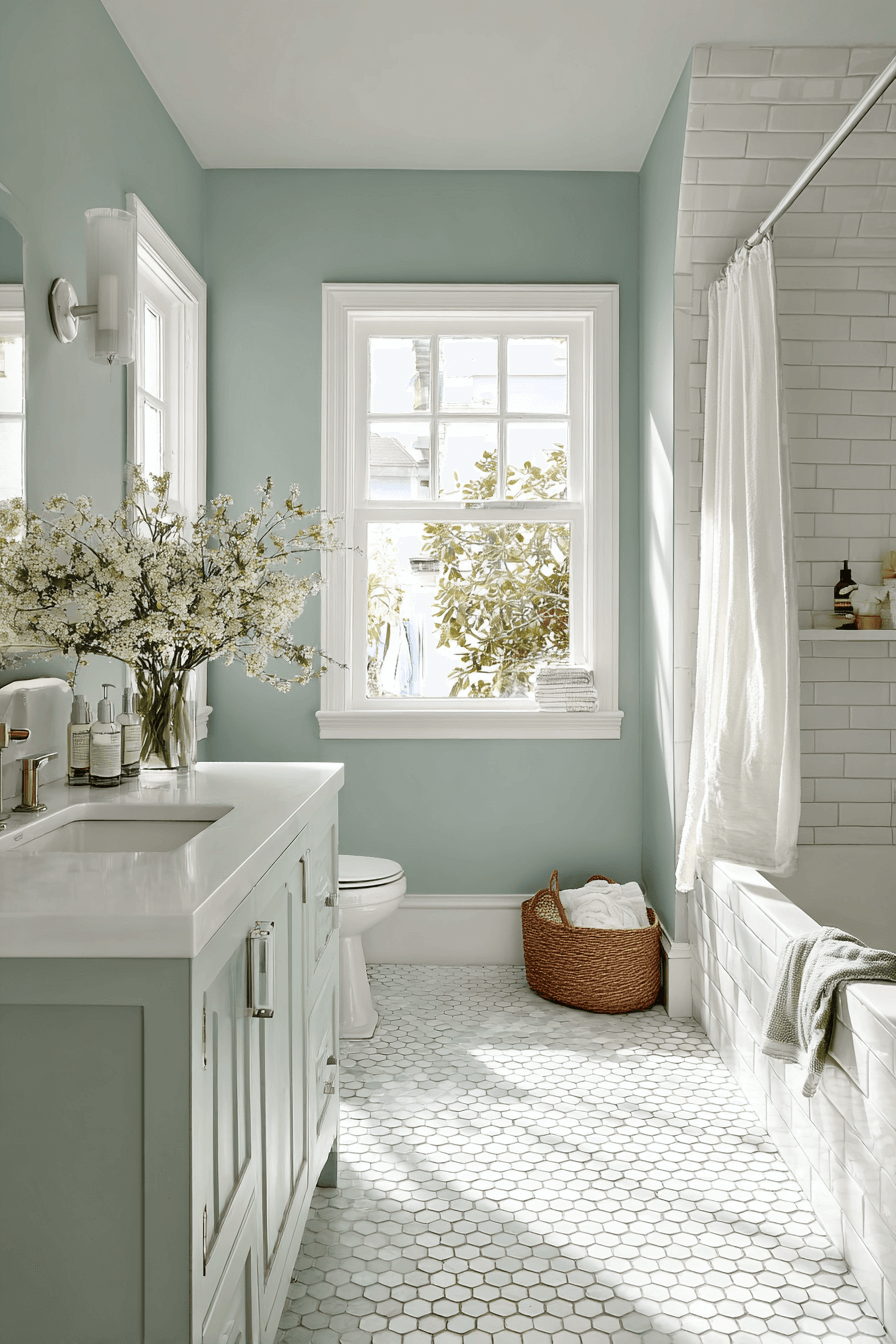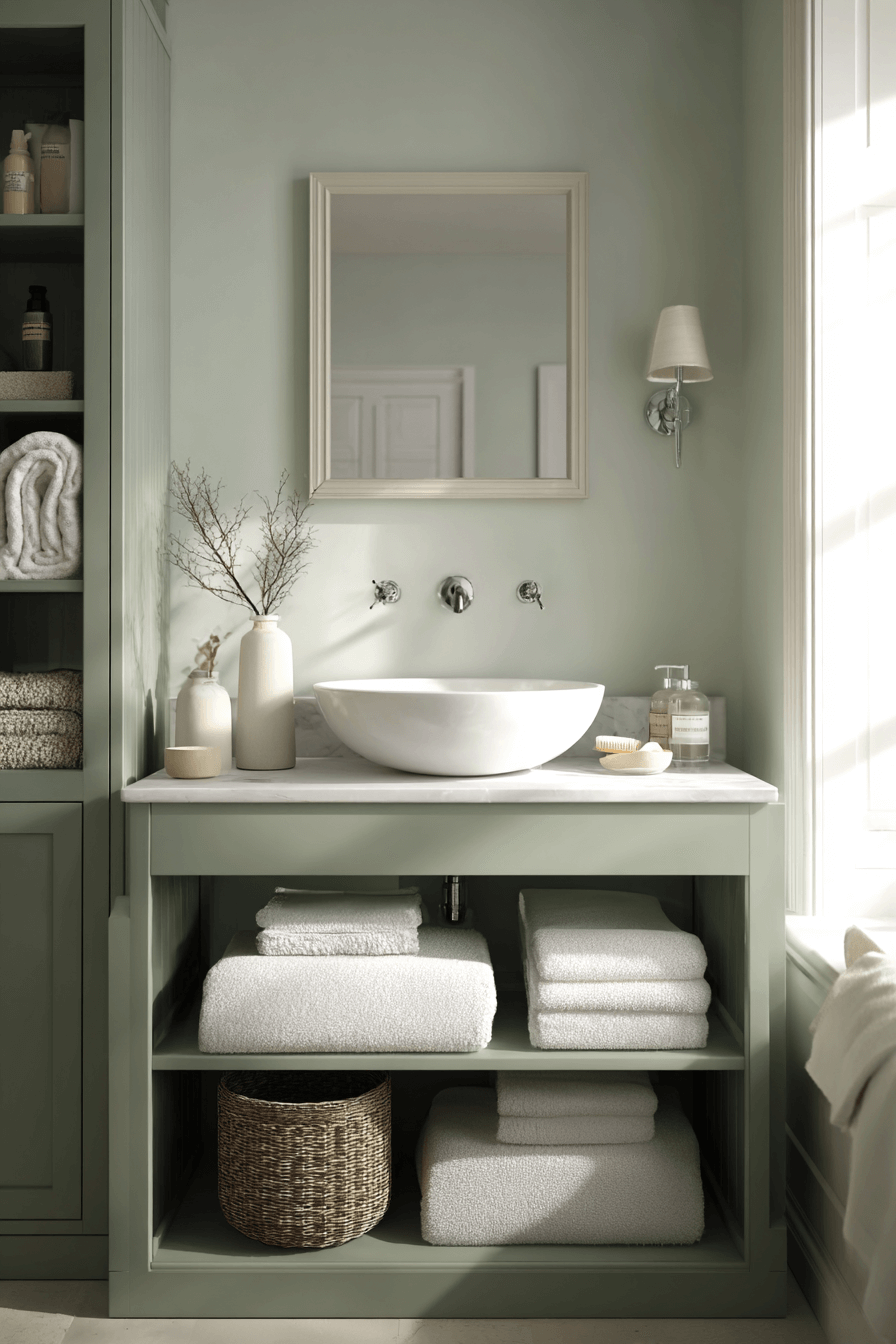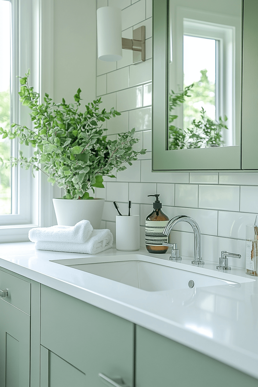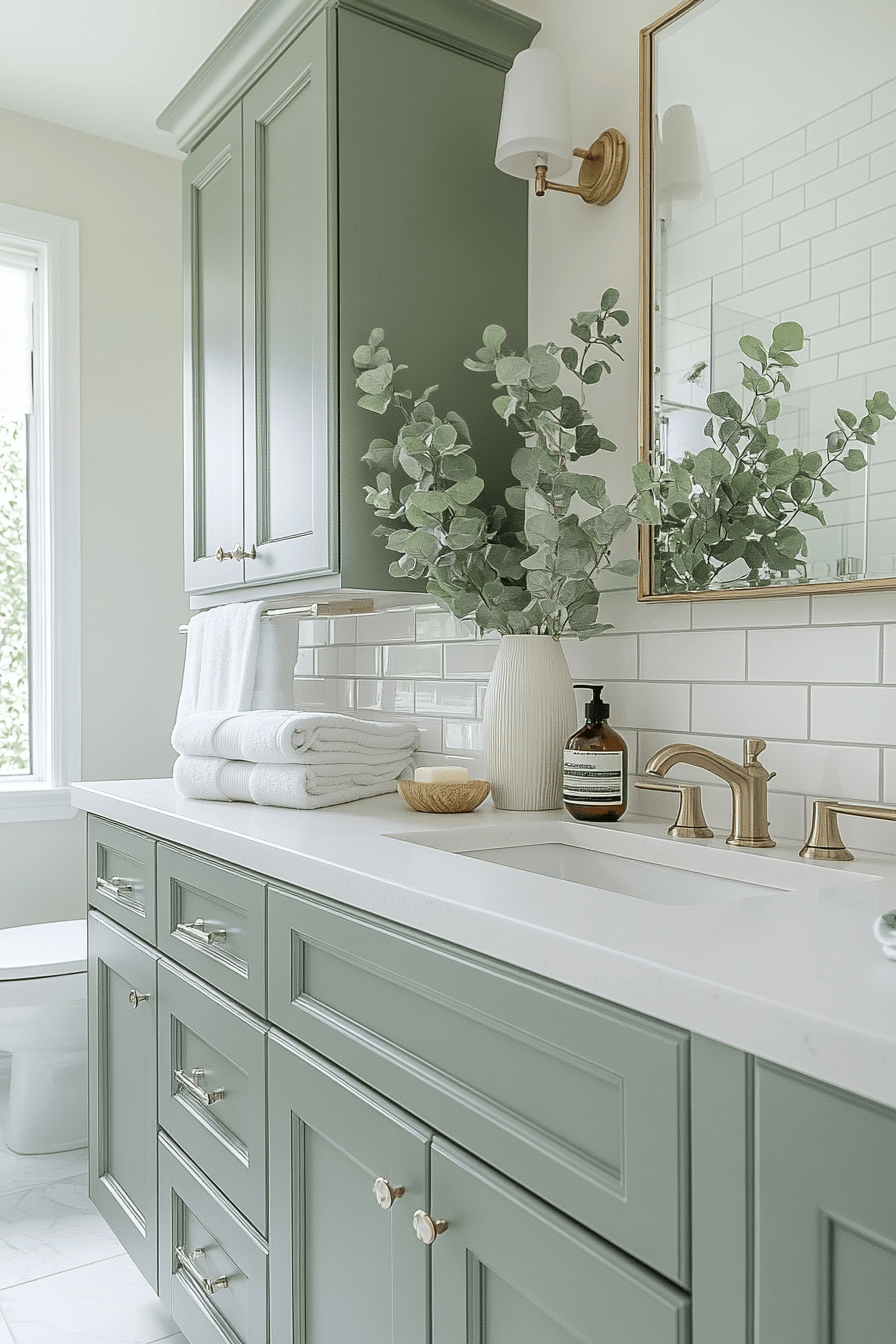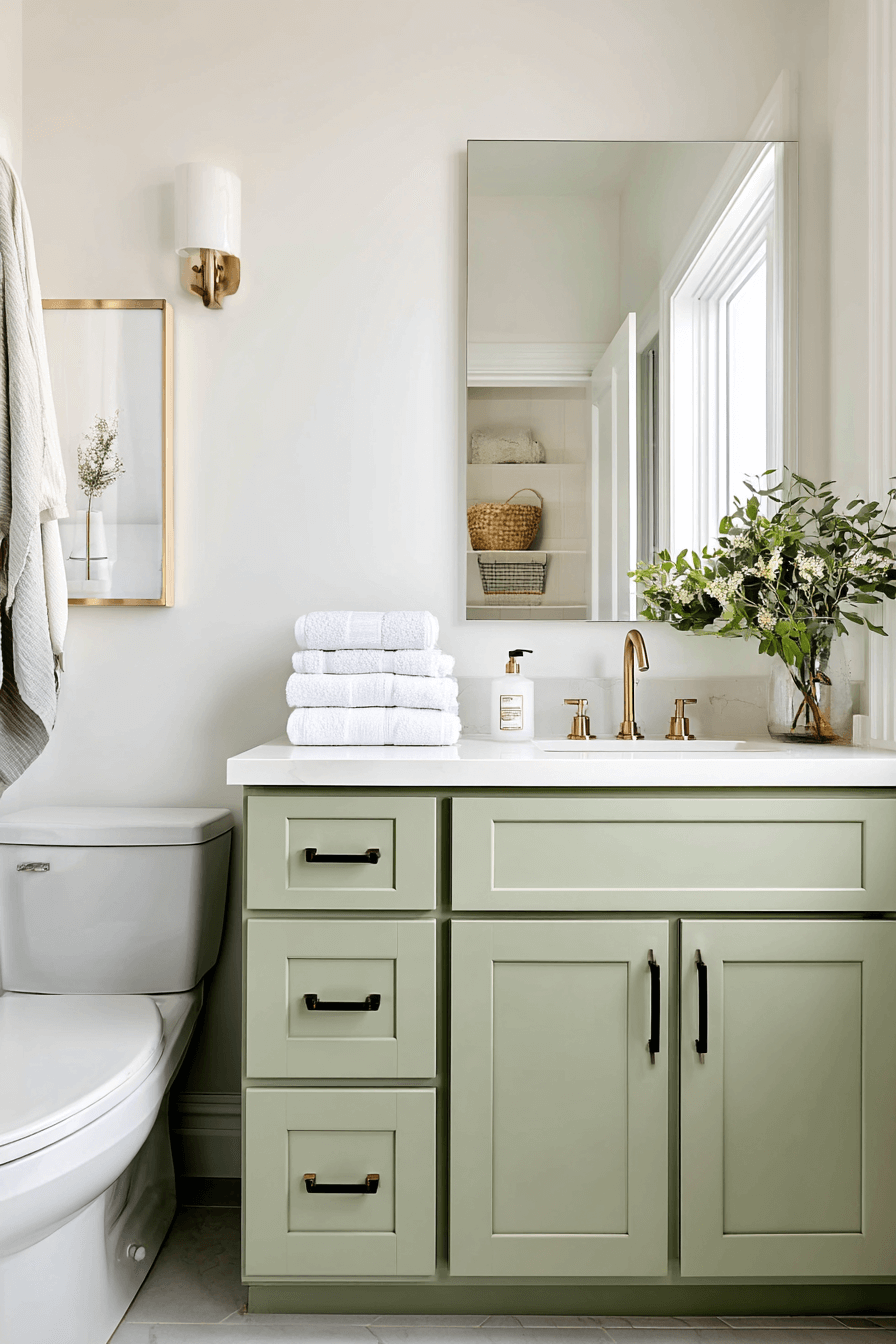 Light and openness take center stage here. A sage green and white bathroom feels expansive when white dominates and sage appears in intentional accents. The green prevents the room from feeling flat or sterile. Even smaller spaces benefit from this visual lift. The atmosphere feels breezy and uplifting. Click to create your own airy escape!