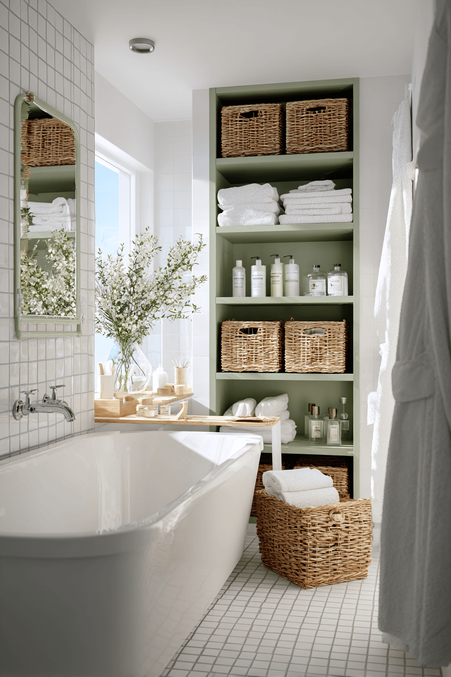 Small updates can completely transform the space. A sage green and white bathroom refreshed with sage accessories against white walls instantly feels warmer. The green adds personality without overwhelming brightness. White keeps everything cohesive and light. It’s subtle but impactful. Tap to add this tranquil touch today!
