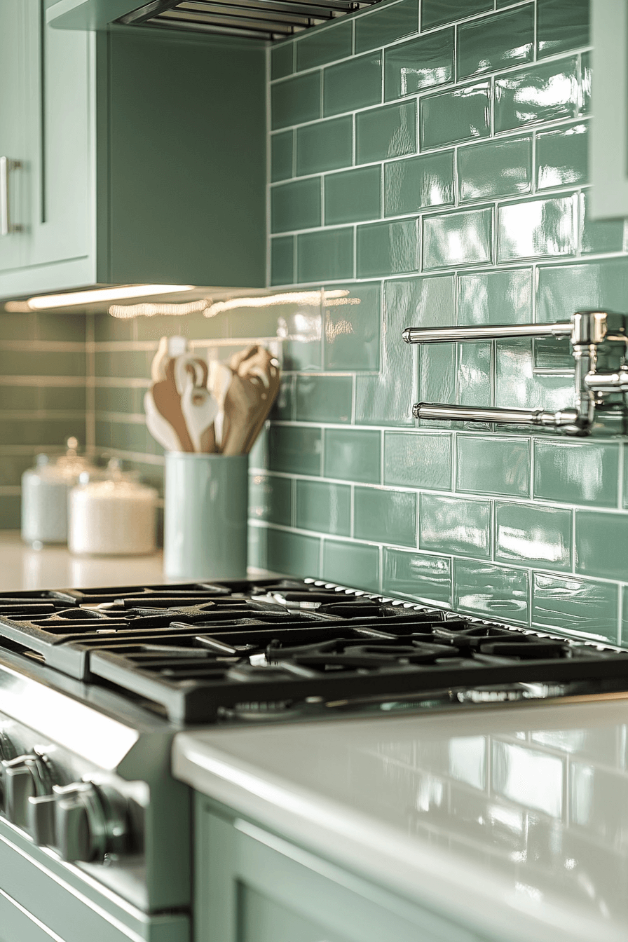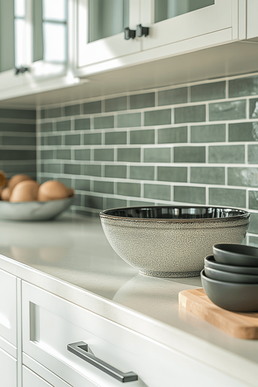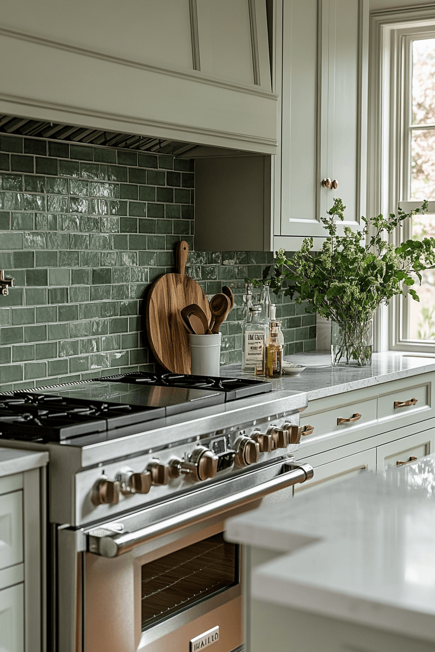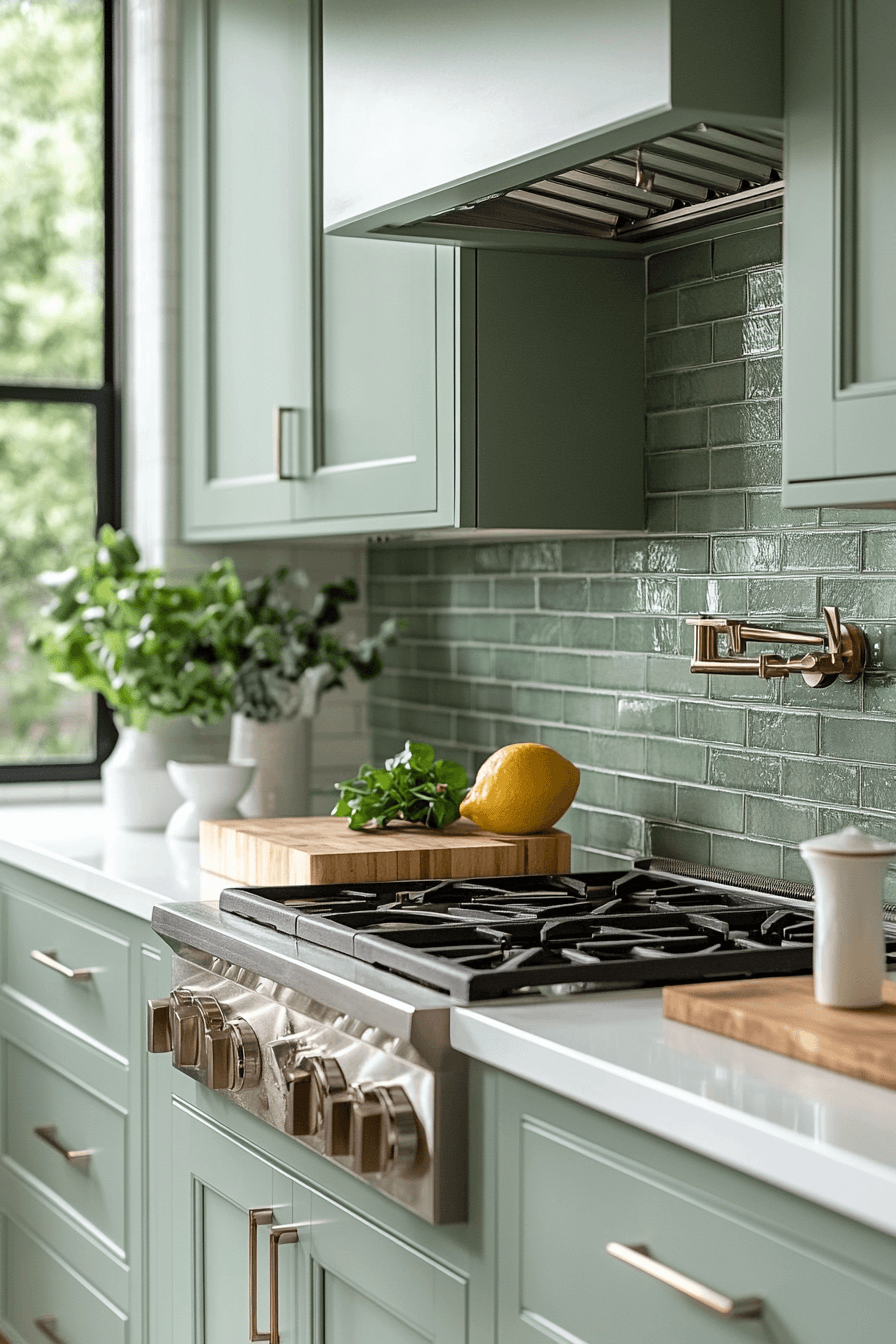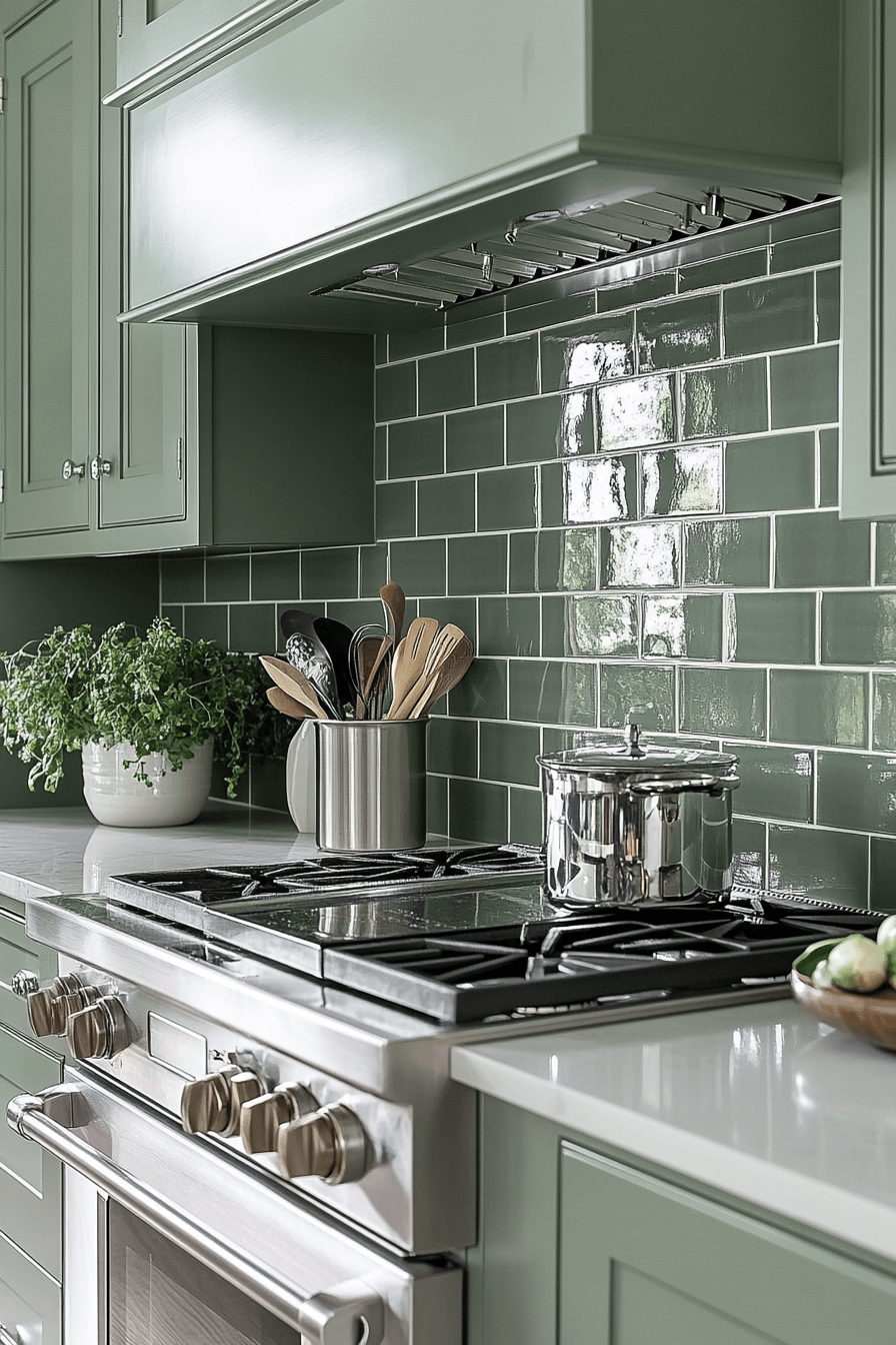 Vertical tile installation adds height and sleekness to a sage green backsplash kitchen. The upward direction elongates walls beautifully. Sage softens the architectural lines. The result feels clean and contemporary. It’s an easy way to modernize a kitchen instantly. Click to explore vertical tile inspiration.