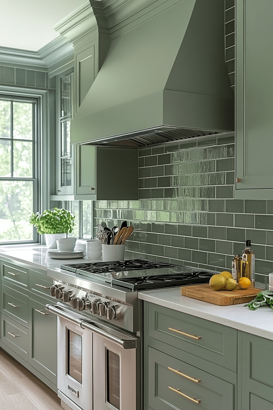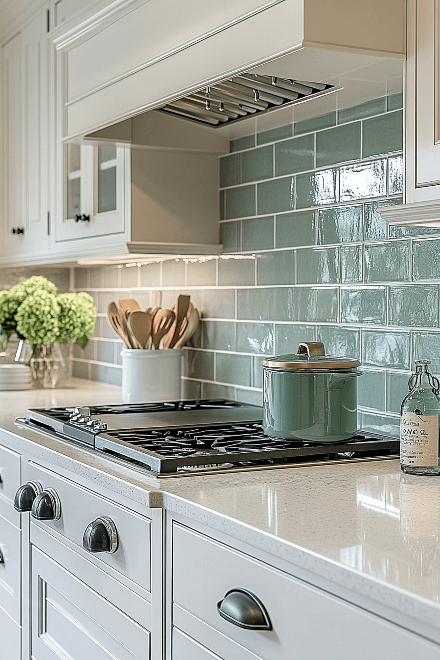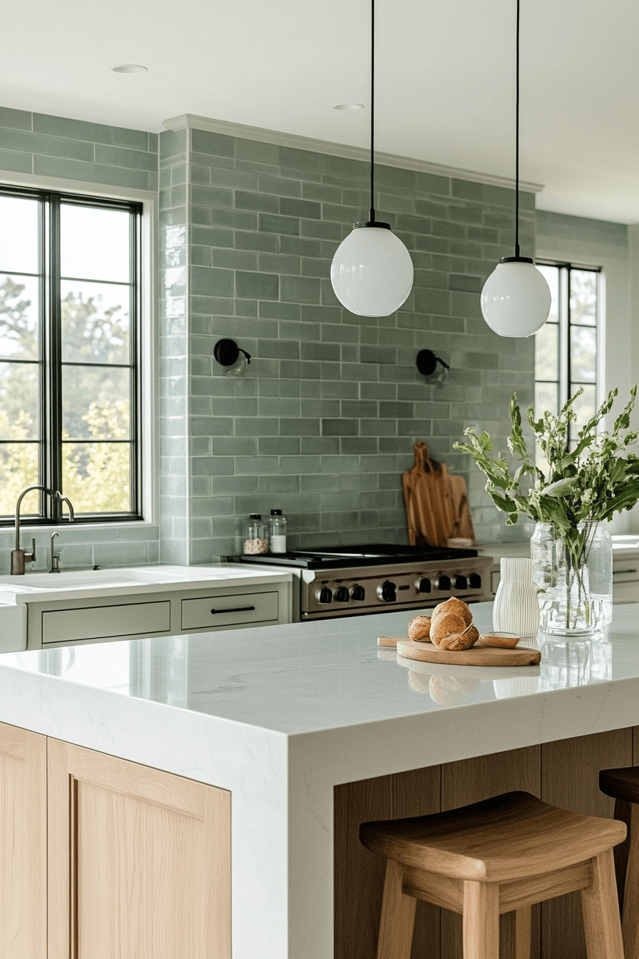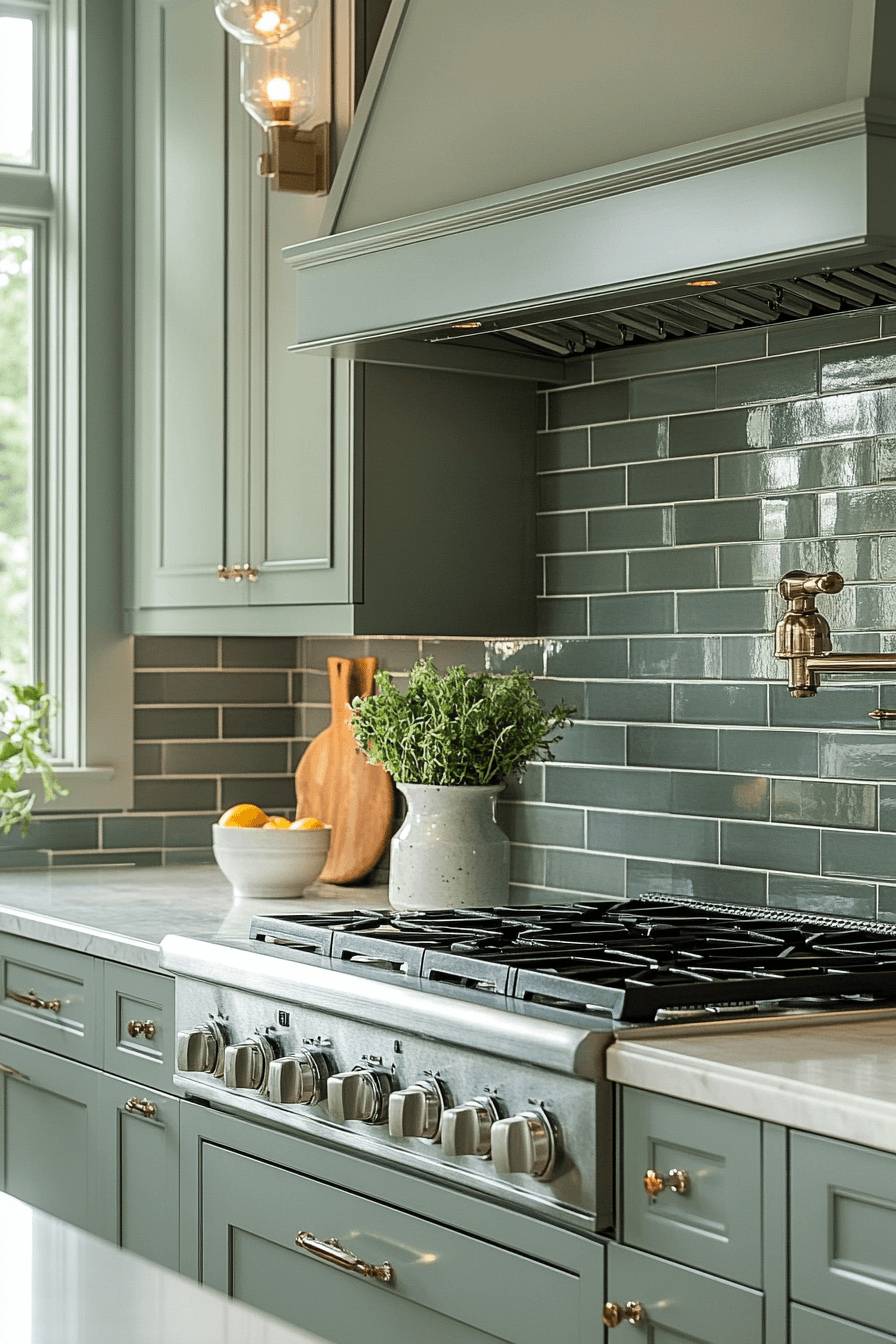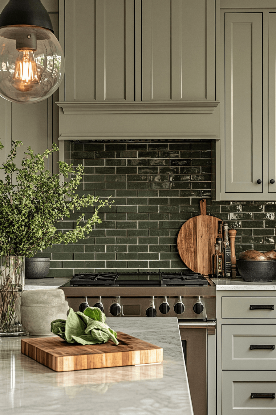 Vertical tile installation adds height and sleekness to a sage green backsplash kitchen. The upward direction elongates walls beautifully. Sage softens the architectural lines. The result feels clean and contemporary. It’s an easy way to modernize a kitchen instantly. Click to explore vertical tile inspiration.