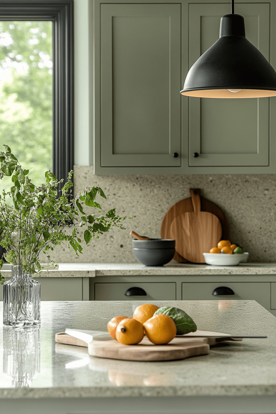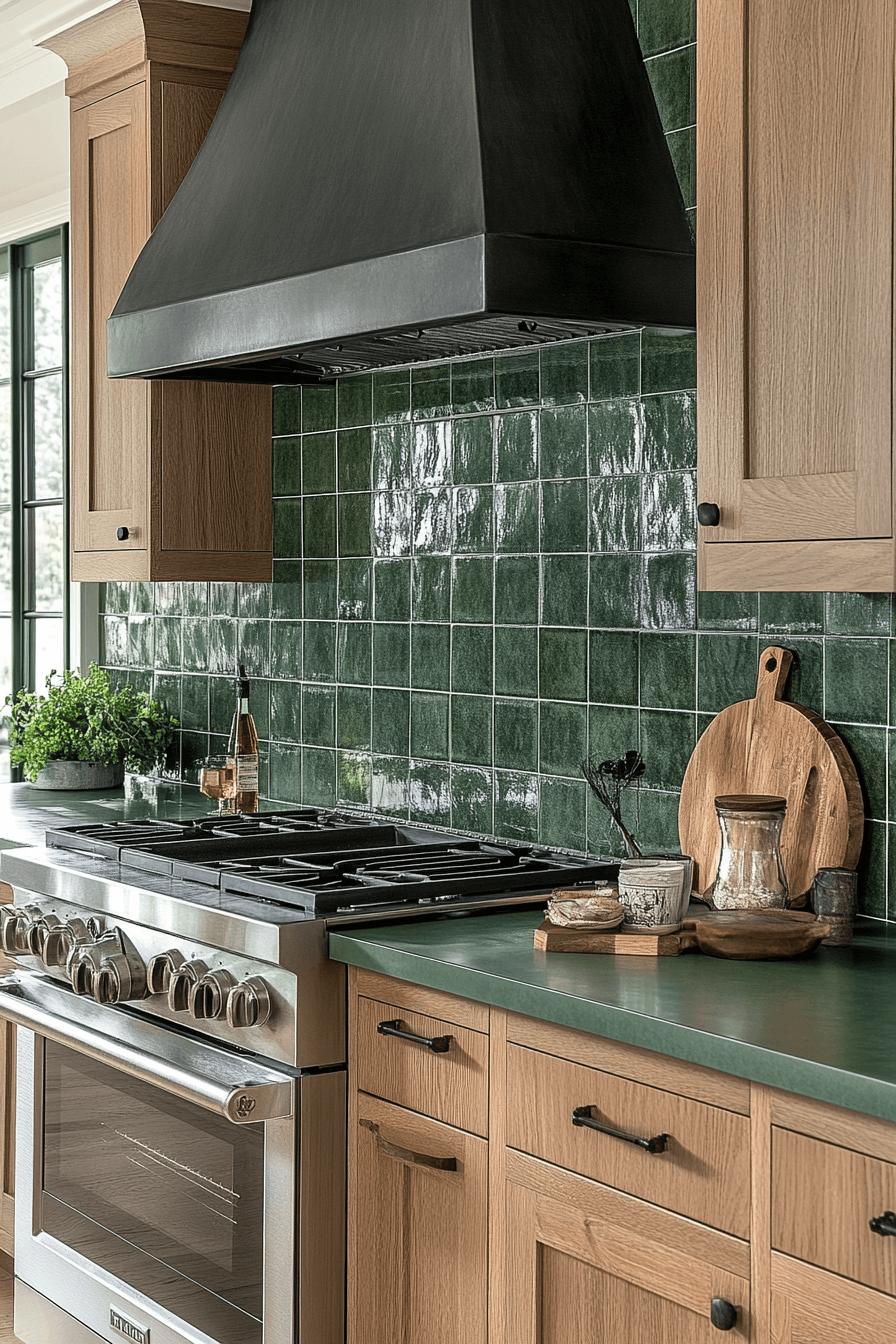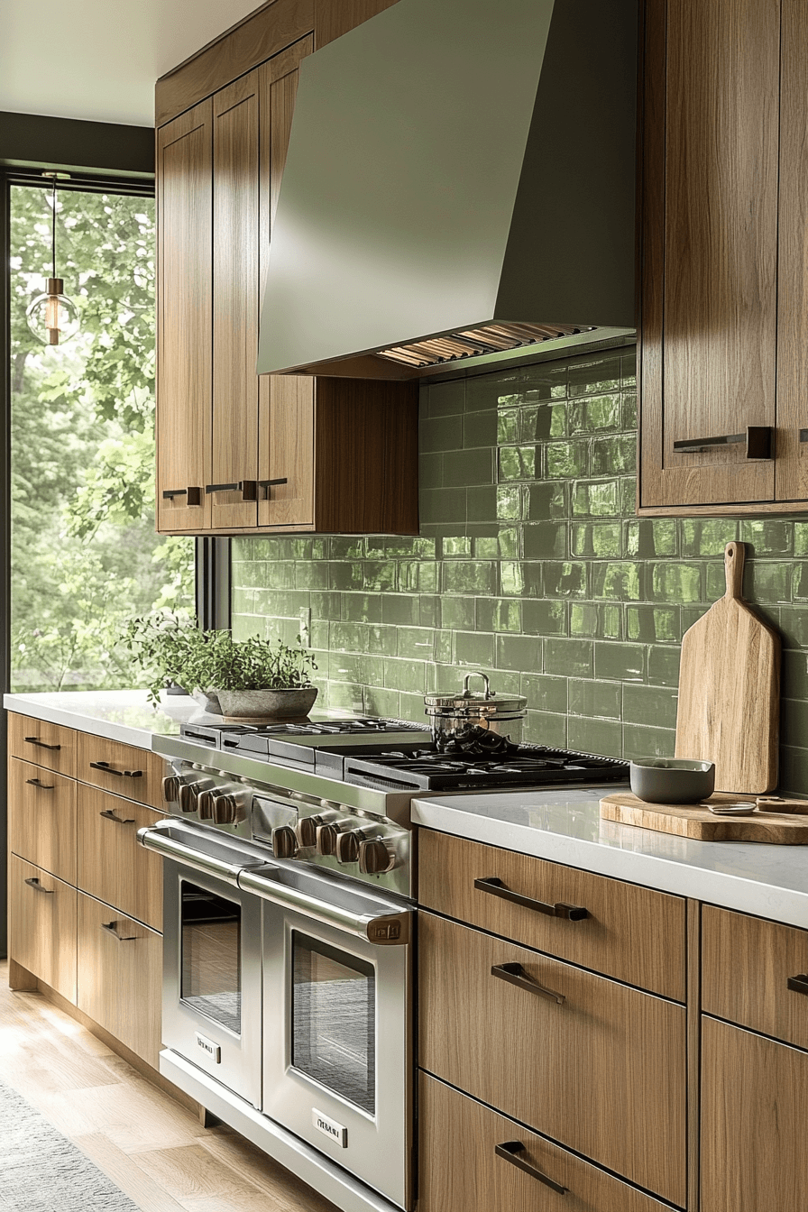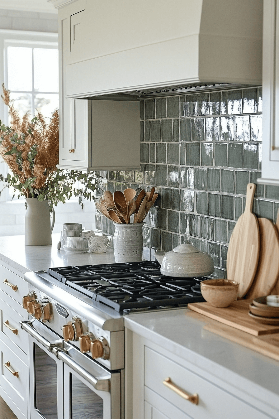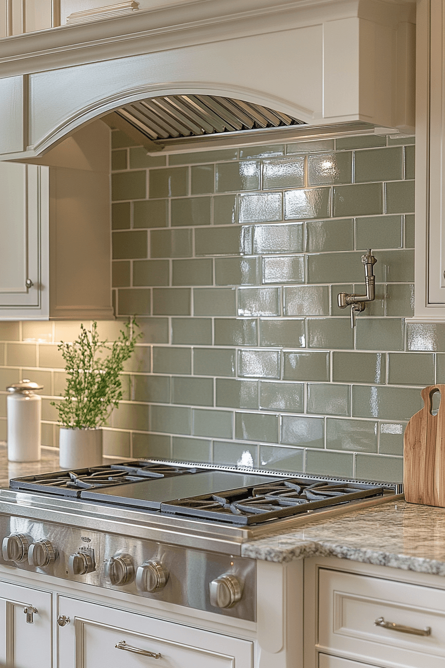 Vertical tile installation adds height and sleekness to a sage green backsplash kitchen. The upward direction elongates walls beautifully. Sage softens the architectural lines. The result feels clean and contemporary. It’s an easy way to modernize a kitchen instantly. Click to explore vertical tile inspiration.