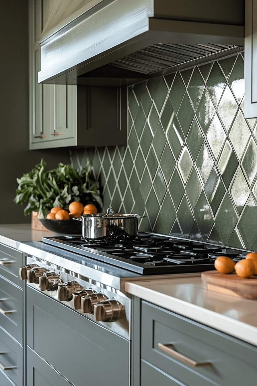 Geometric sage tiles bring artistic flair to a sage green backsplash kitchen. Bold shapes add personality without overwhelming the room. The structured layout keeps everything intentional. Sage tones balance the design beautifully. It’s modern creativity with coastal softness. Tap to explore geometric backsplash styles.