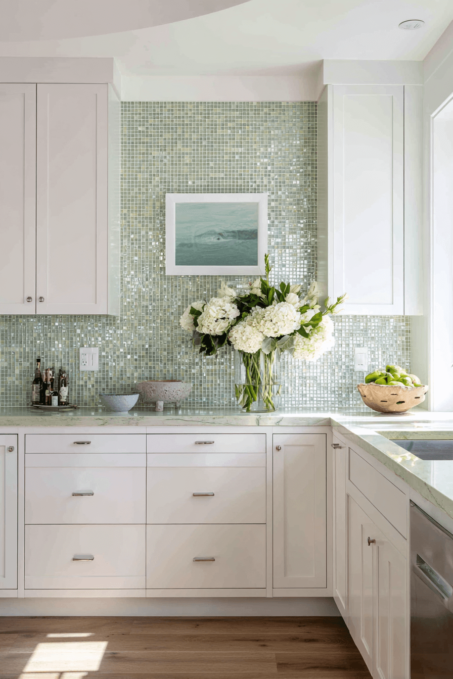 Glass sage tiles introduce luminous depth to a sage green backsplash kitchen. The subtle shine reflects natural light, making smaller spaces feel bigger. The green hue remains soft despite the shimmer. It pairs effortlessly with marble and brass finishes. The look feels airy and elegant. Click to see how glass tile adds dimension.