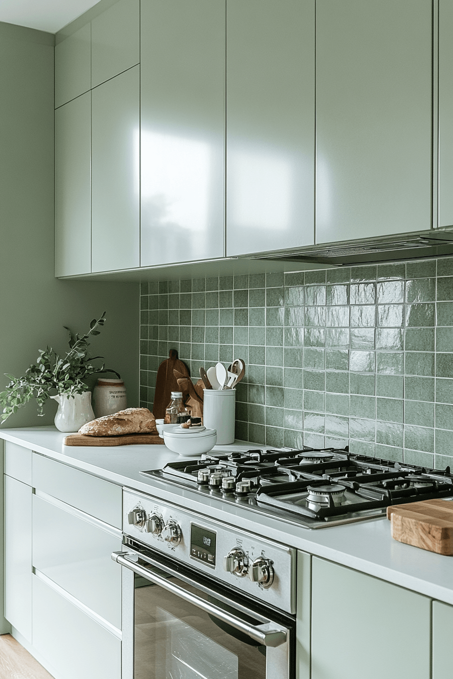 Streamlined sage tiles bring effortless modern appeal to a sage green backsplash kitchen. Clean lines and simple layouts allow the color to shine without distraction. The restrained design keeps the space airy and uncluttered. Soft neutrals surrounding the backsplash enhance its calming effect. The result feels fresh, refined, and thoughtfully styled. Click to explore this minimalist sage aesthetic.