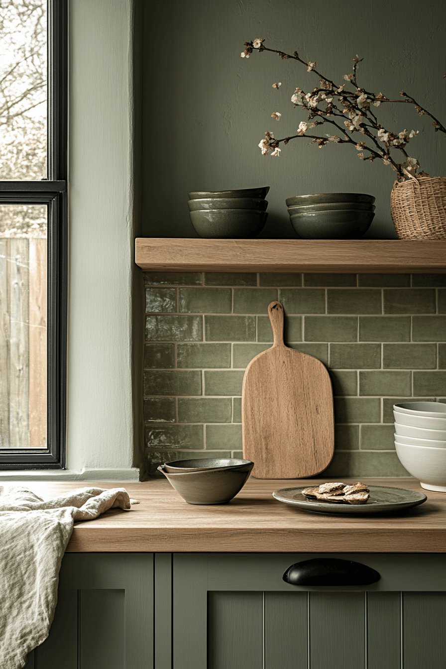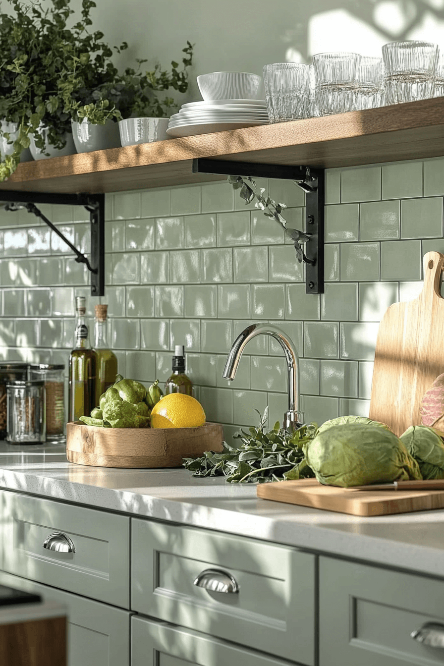 A statement sage accent wall adds depth and focus to a sage green backsplash kitchen. Instead of heavy décor, one intentional color feature anchors the space. The muted green feels sophisticated yet welcoming. This approach works especially well in open kitchens where flow matters. It’s bold without feeling busy. Click to discover how a sage focal wall elevates your kitchen.
