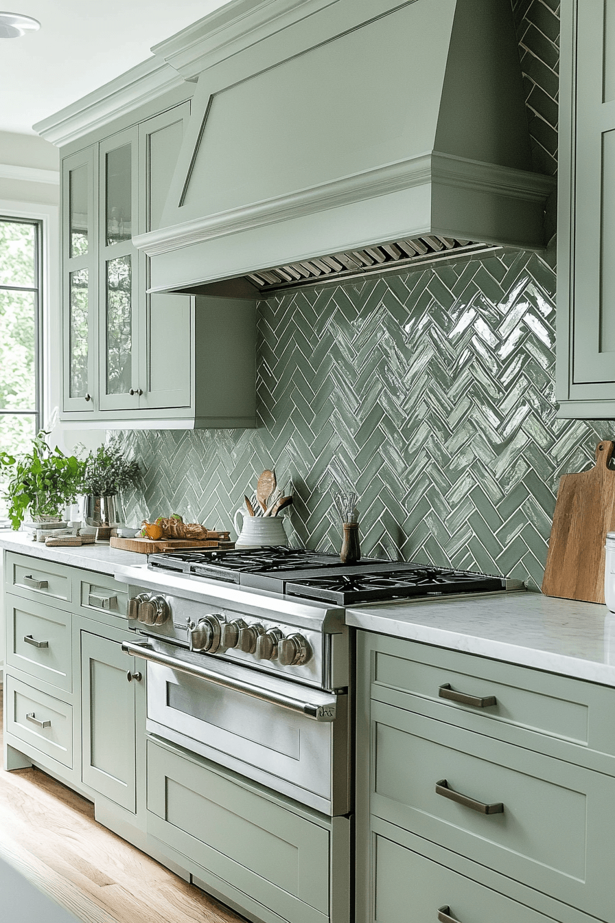 Chevron patterns introduce graceful movement into a sage green backsplash kitchen without overwhelming the design. The angled layout feels dynamic yet controlled. Sage tones soften the bold geometry. This pairing works beautifully with both cool and warm finishes. It’s playful but polished. Click to explore chevron-inspired inspiration.