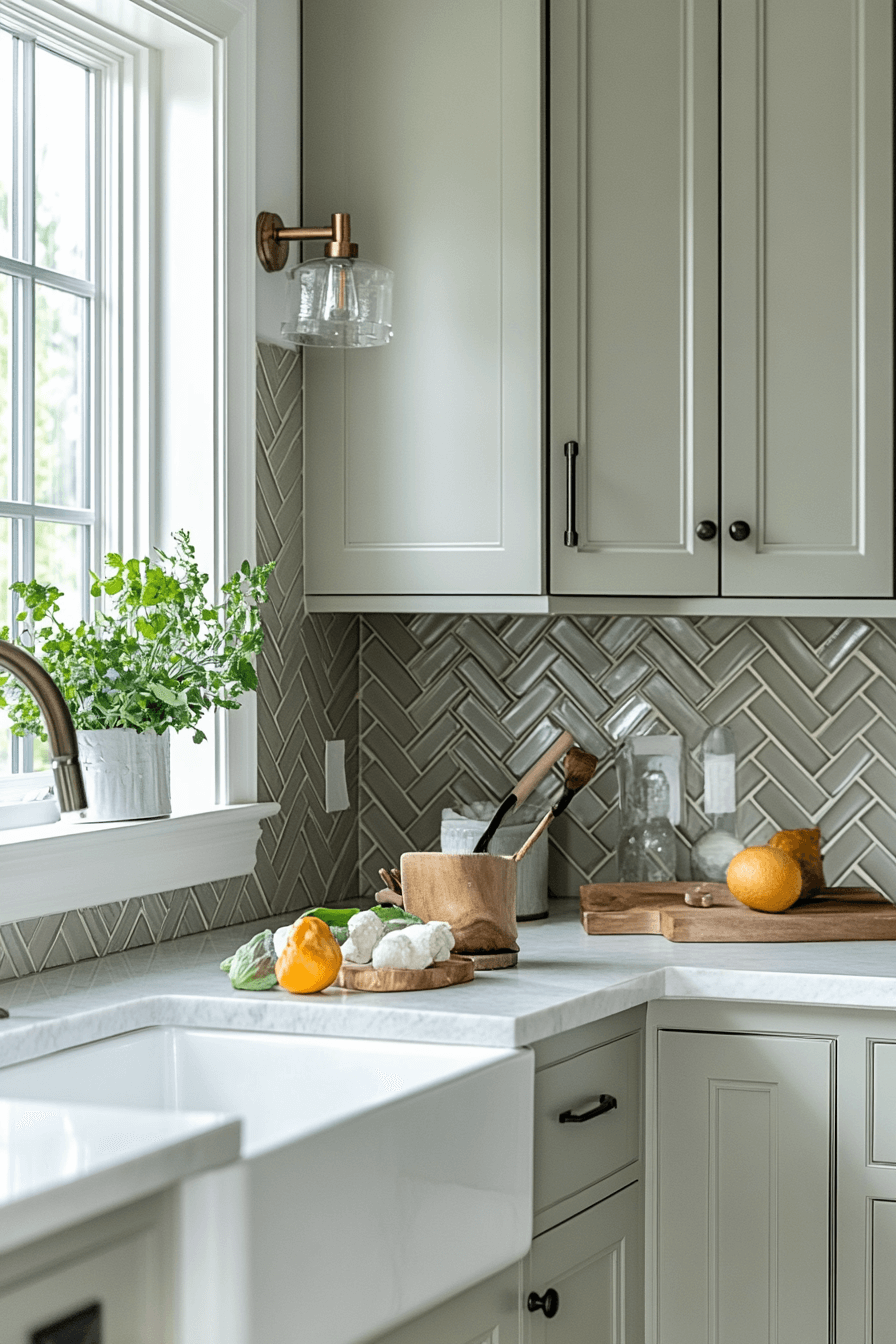 A refined herringbone layout adds timeless texture to a sage green backsplash kitchen. The interlocking pattern feels elegant and layered. Sage coloring keeps it modern rather than traditional. The result feels detailed yet cohesive. It’s pattern with a polished finish. Tap to see why herringbone remains a favorite.