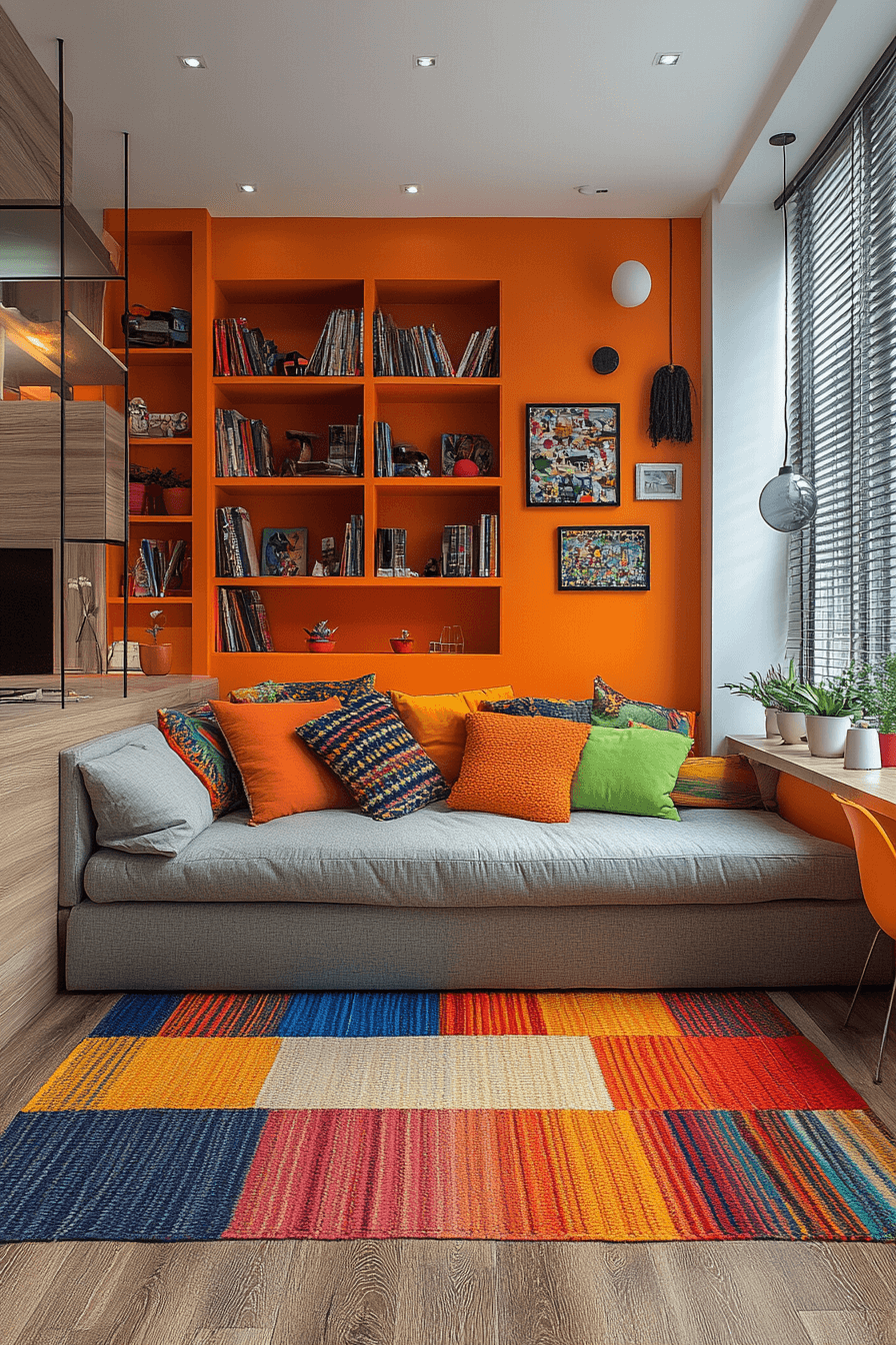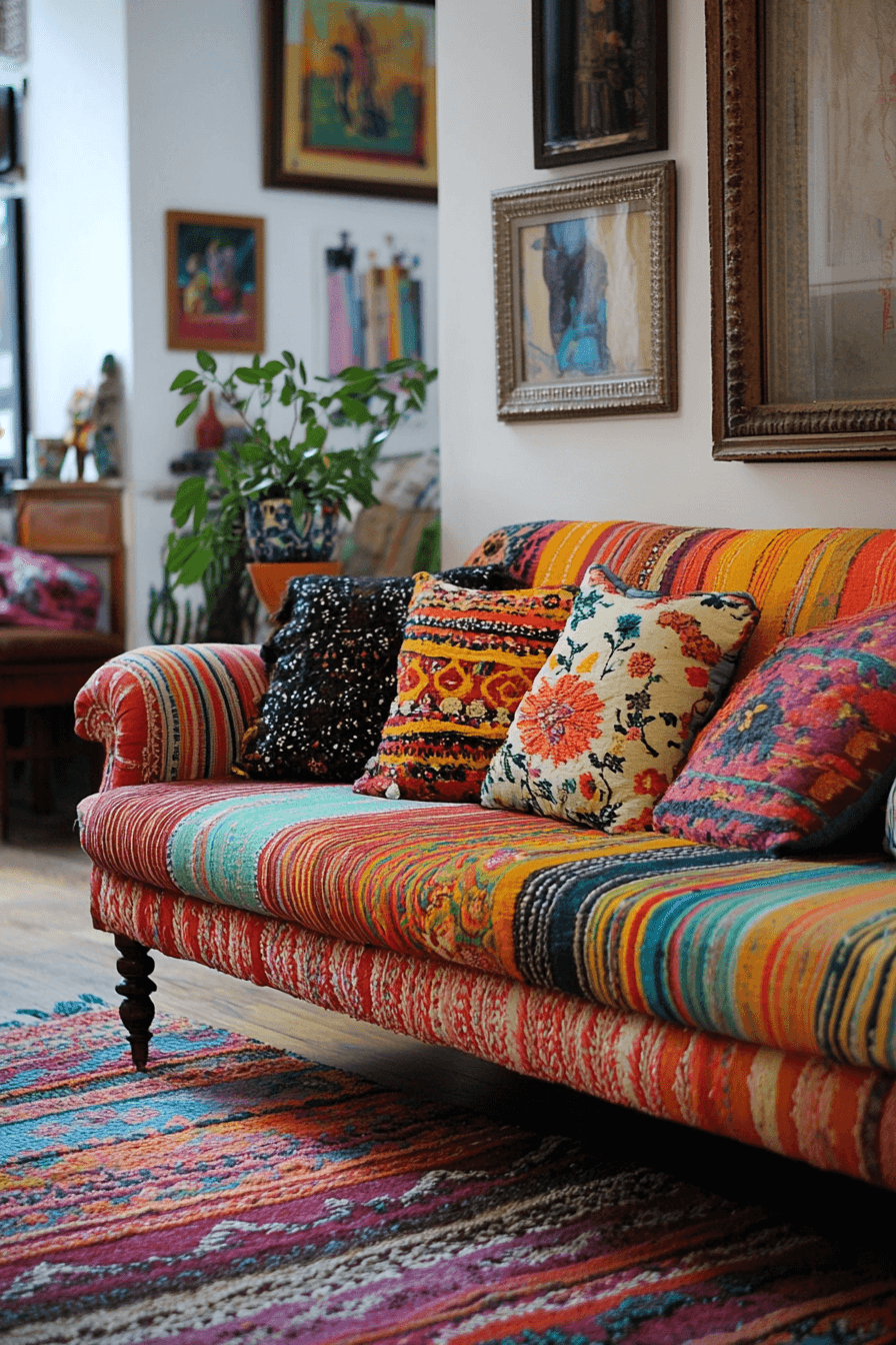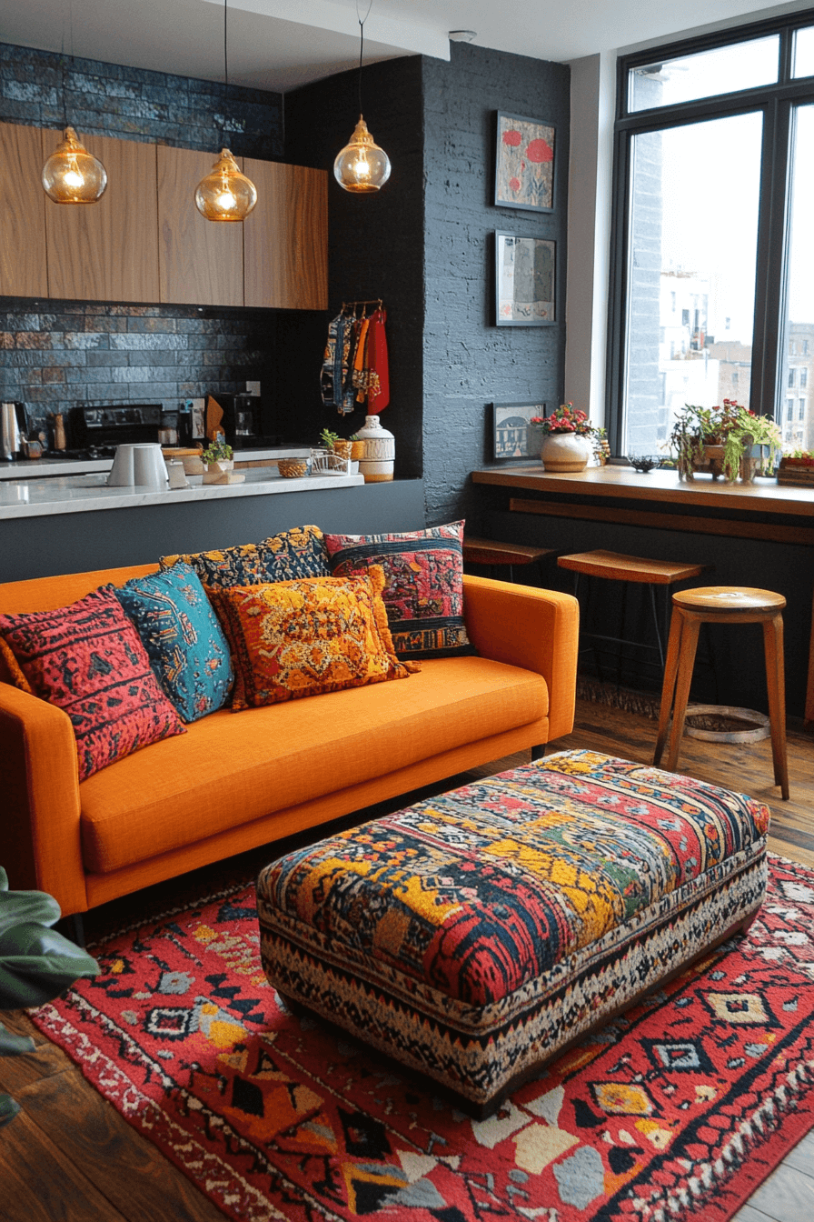 Bring energy with bright hues and lively prints. Colorful rugs, patterned pillows, and plants create an uplifting, dynamic atmosphere.