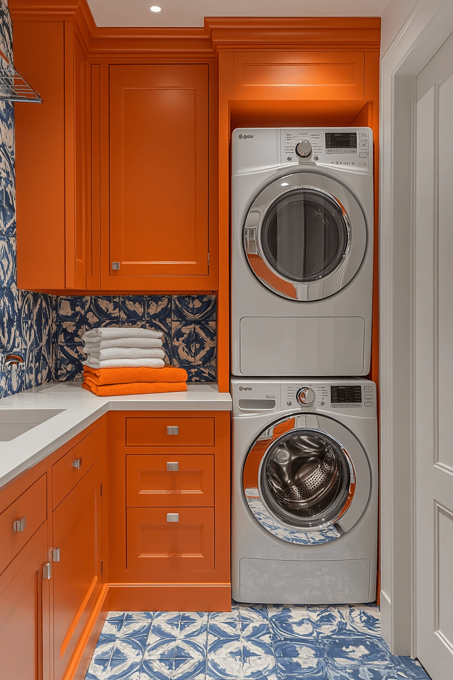 Use colorful storage pieces and vertical shelving for functionality and style. Bright finishes turn practical solutions into visual highlights.
