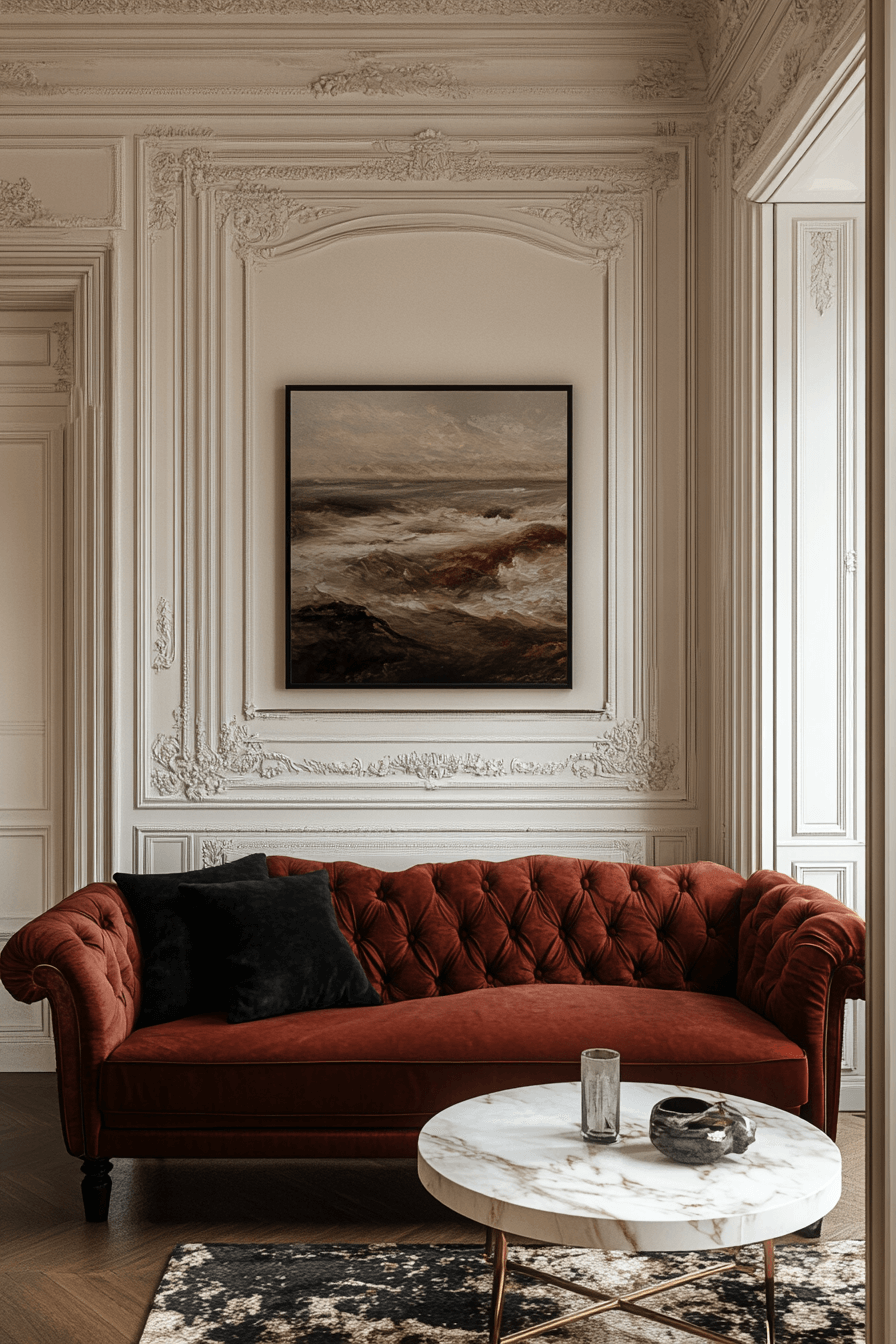Elevate your home with luxe fabrics and vibrant statement pieces. Silk curtains, plush rugs, and metallics create a grand, indulgent vibe in small spaces.