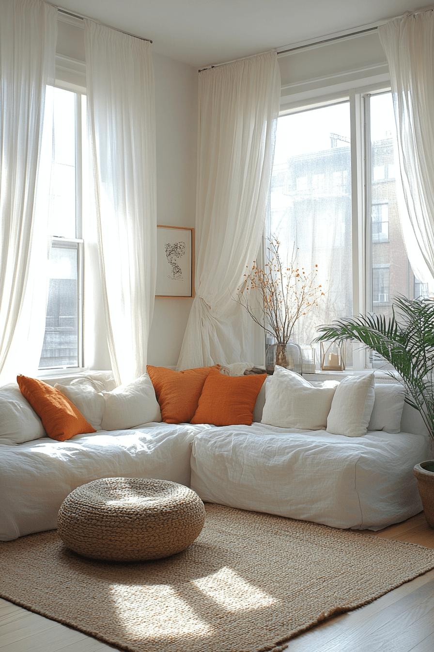 Play with light hues, mirrors, and clever furniture placement to create a spacious feel. Sheer curtains and reflective surfaces enhance brightness and elegance.