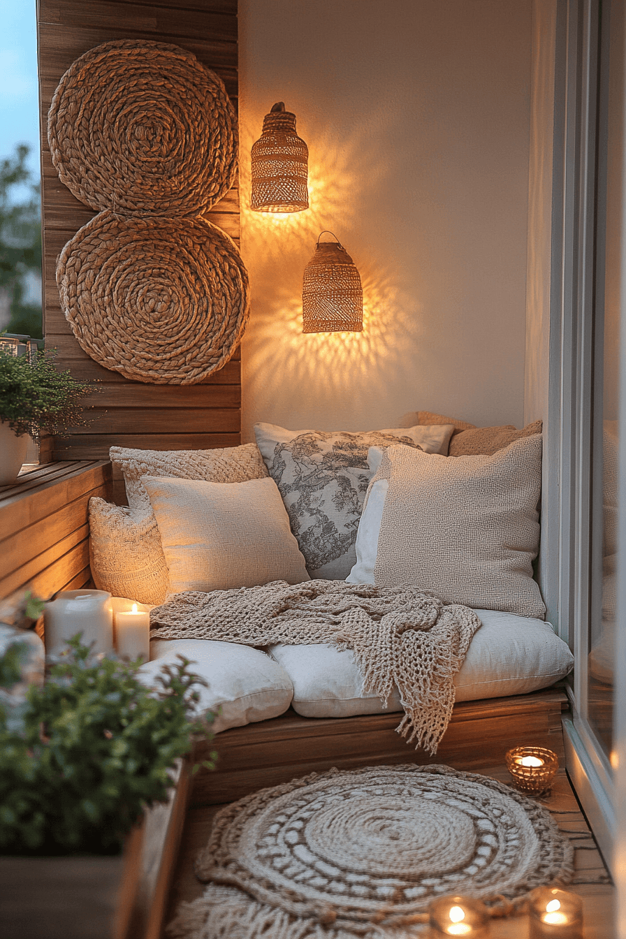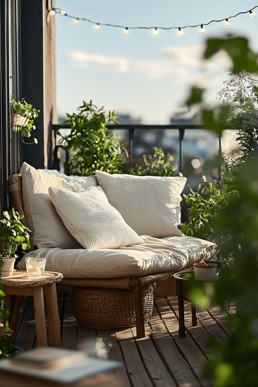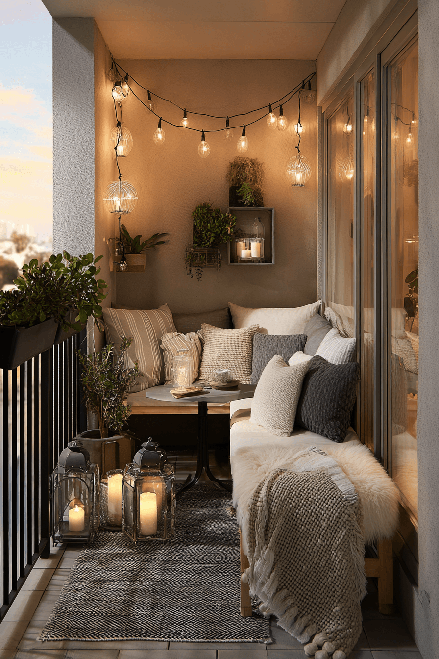 Layered fabrics and subtle lighting add depth to a compact balcony nook. A mix of textures creates visual richness without adding extra items. These small balcony decor ideas rely on layering rather than clutter. Light tones help reflect brightness and keep the space open. Soft lighting enhances the cozy effect. A small seating arrangement completes the layout. The vibe feels warm, stylish, and inviting. Explore how to layer textures outdoors.