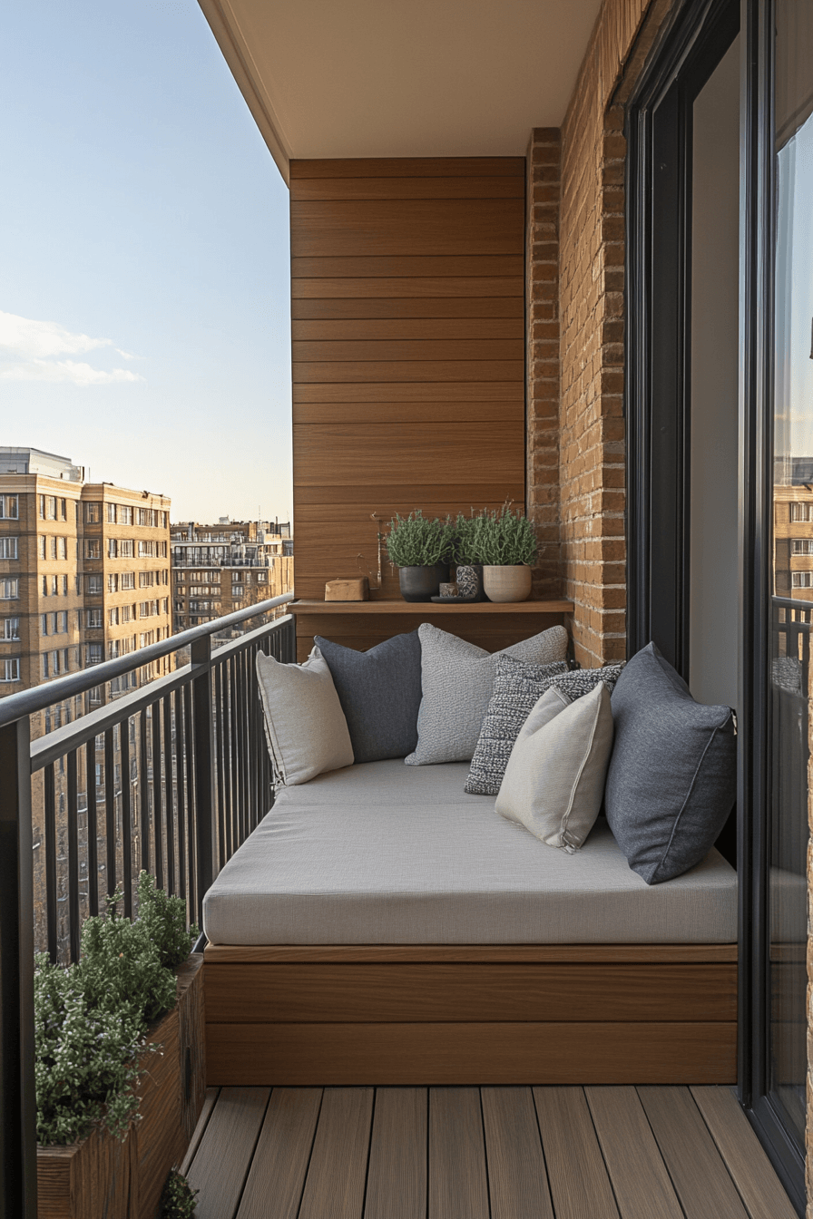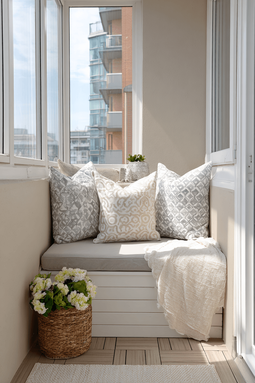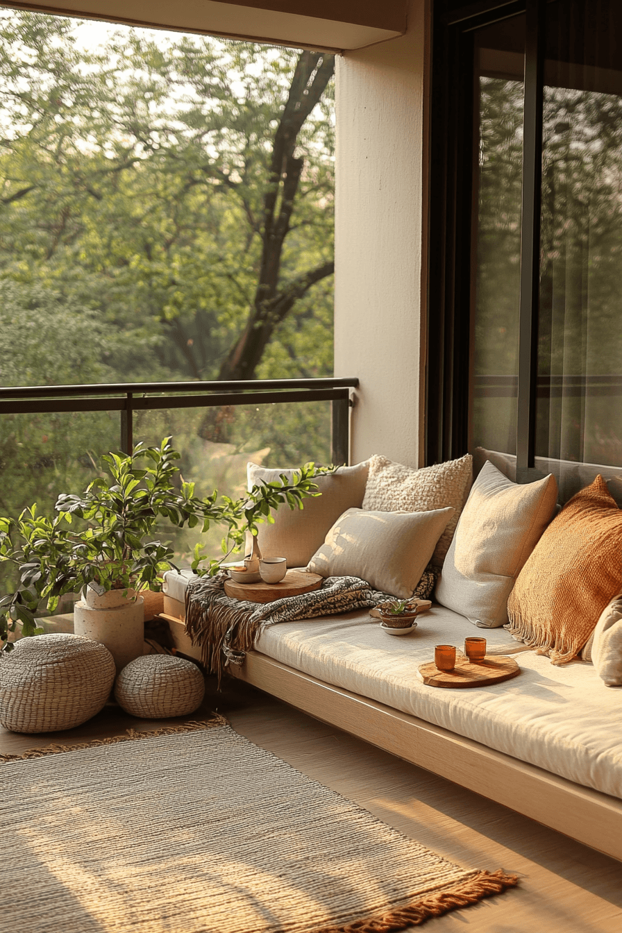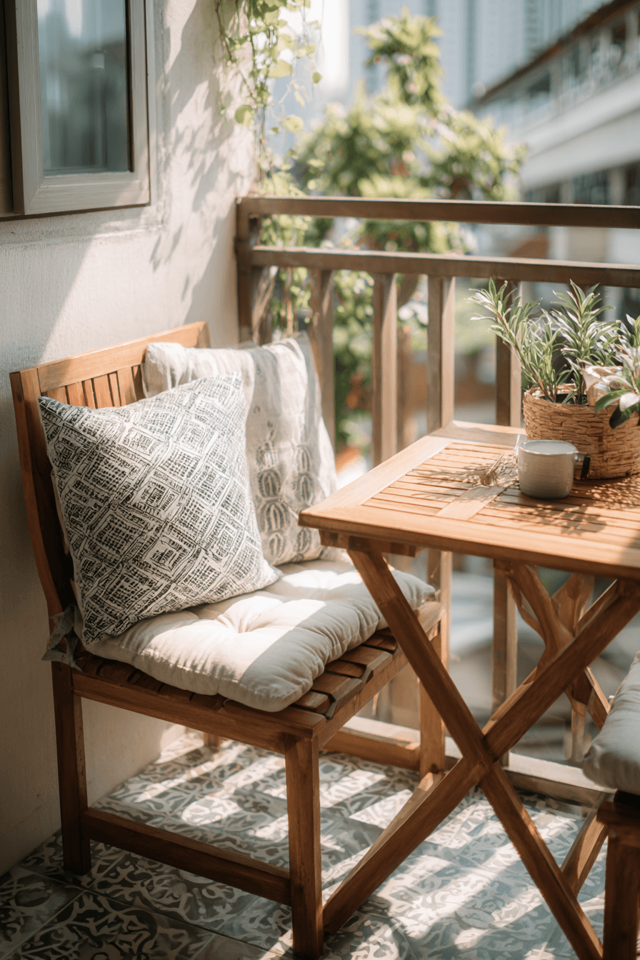 Cushions placed along a ledge create a relaxed and comfortable seating area. Compact arrangements maximize space while maintaining flexibility. These small balcony decor ideas turn edges into cozy gathering spots. Neutral fabrics keep the look calm and cohesive. A throw or pillow adds extra comfort without bulk. The setup is easy to adjust. The atmosphere feels casual, cozy, and welcoming. Click to create your cushioned lounge.