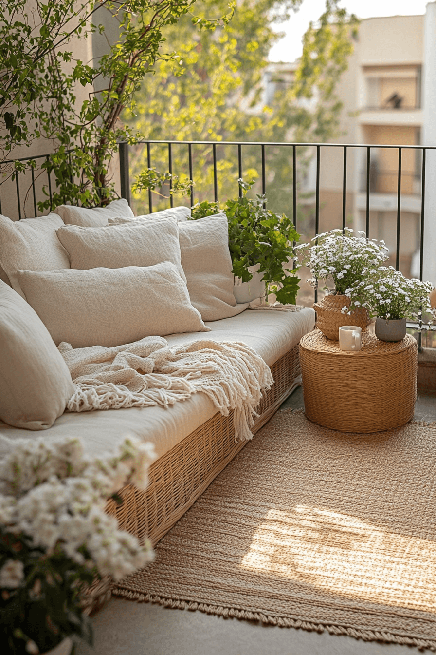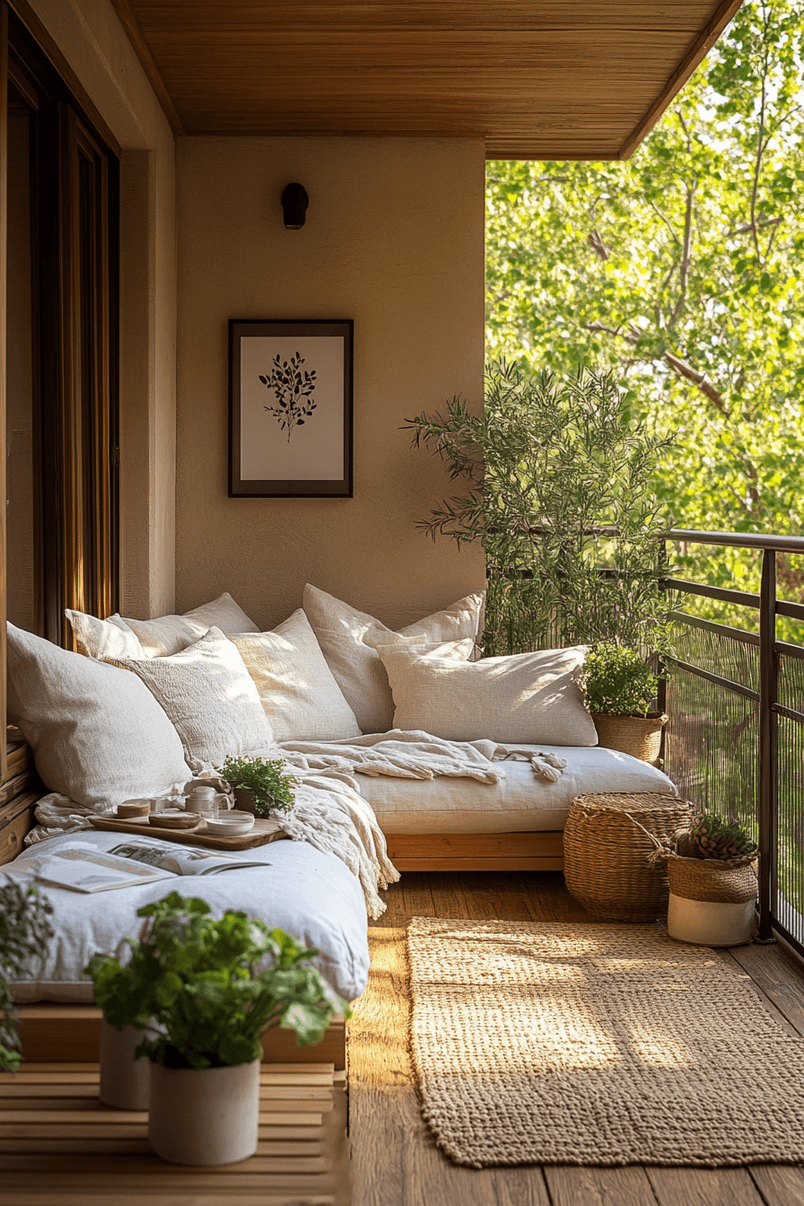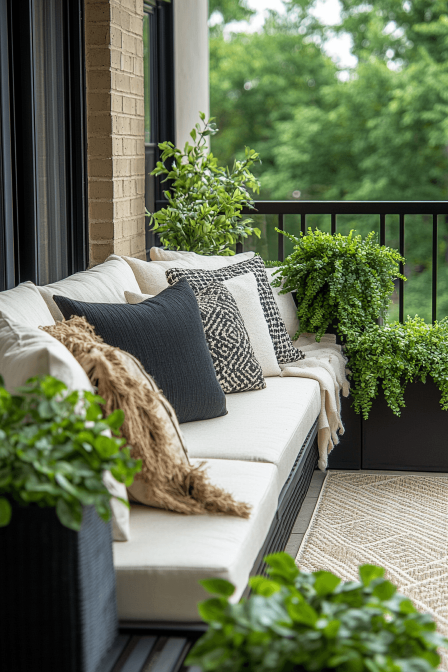 Cushions placed along a ledge create a relaxed and comfortable seating area. Compact arrangements maximize space while maintaining flexibility. These small balcony decor ideas turn edges into cozy gathering spots. Neutral fabrics keep the look calm and cohesive. A throw or pillow adds extra comfort without bulk. The setup is easy to adjust. The atmosphere feels casual, cozy, and welcoming. Click to create your cushioned lounge.