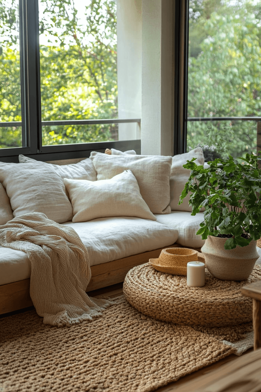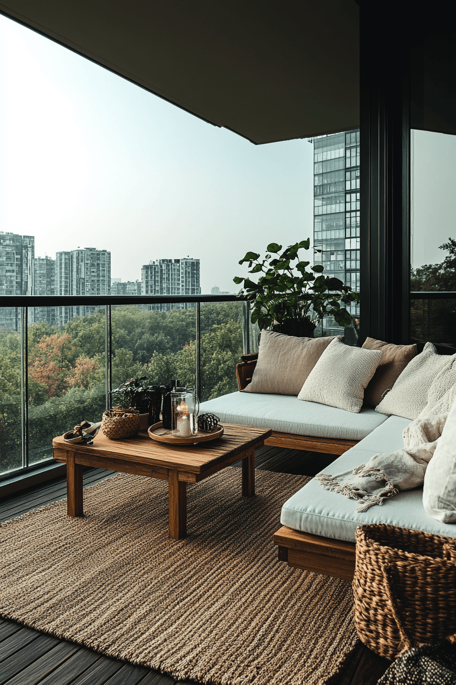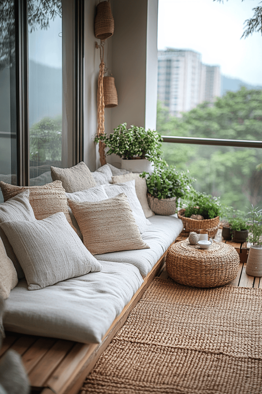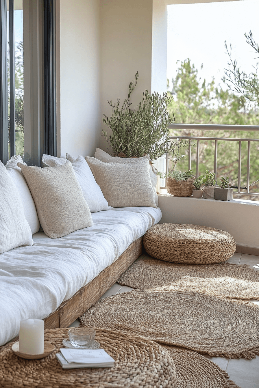 Cushions placed along a ledge create a relaxed and comfortable seating area. Compact arrangements maximize space while maintaining flexibility. These small balcony decor ideas turn edges into cozy gathering spots. Neutral fabrics keep the look calm and cohesive. A throw or pillow adds extra comfort without bulk. The setup is easy to adjust. The atmosphere feels casual, cozy, and welcoming. Click to create your cushioned lounge.