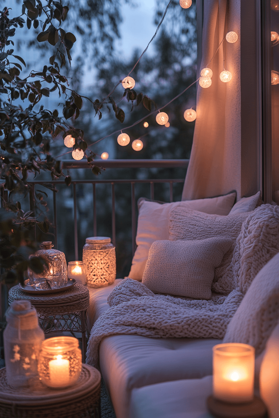 Warm lighting transforms the balcony into a cozy nighttime hangout that feels like an extension of your home. String lights and soft glows make the space usable after sunset. These small balcony decor ideas focus on day-to-night functionality. Cushions, rugs, and throws add comfort without clutter. A small table keeps essentials within reach. Lighting highlights textures beautifully. The atmosphere feels inviting, warm, and relaxed. Discover how to create your evening retreat.