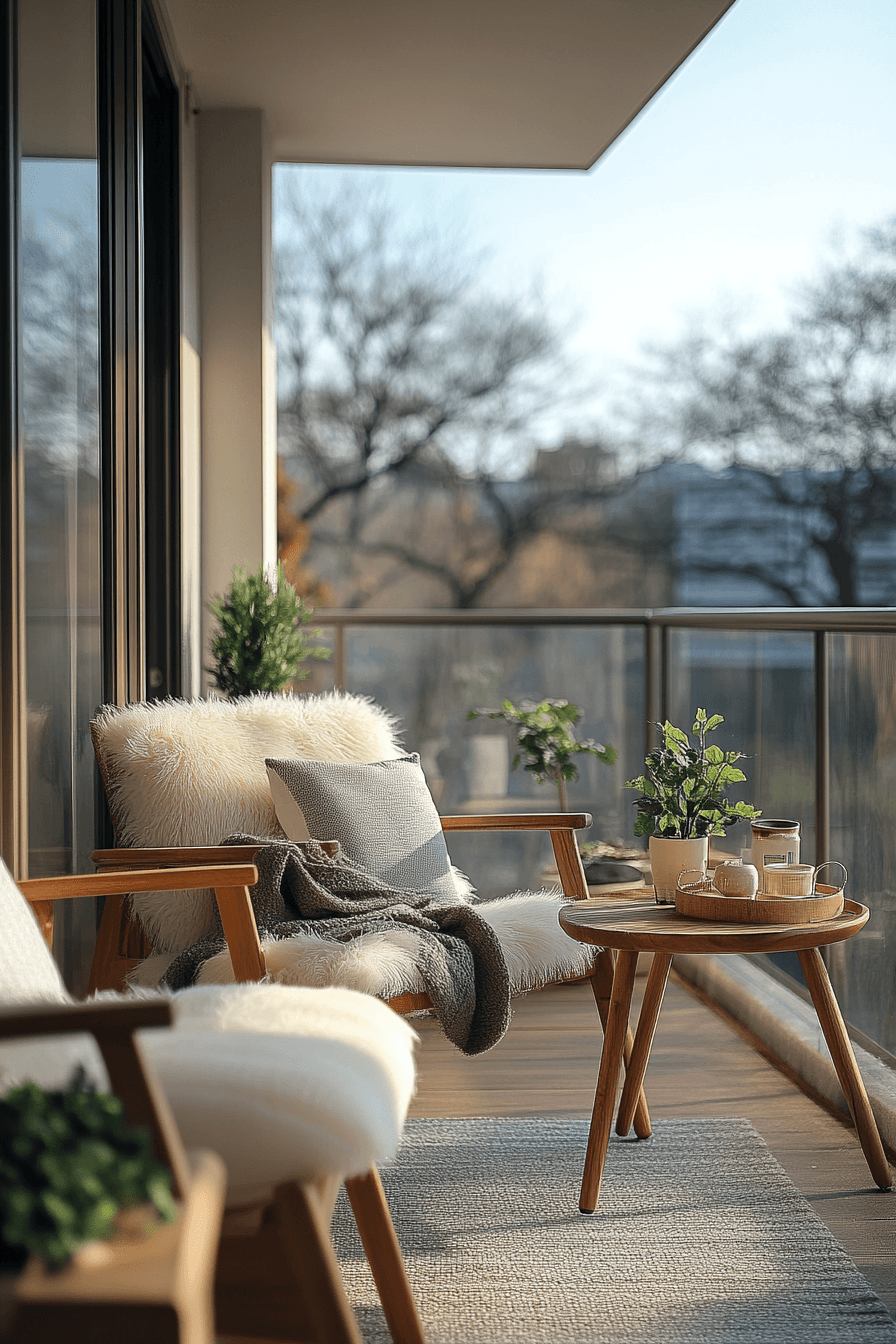 Scandinavian simplicity creates a bright and breathable balcony using light woods and clean forms. Minimal furniture keeps the layout functional without unnecessary extras. These small balcony decor ideas rely on simplicity to make the space feel larger. Soft textiles add warmth while maintaining the minimal aesthetic. Natural light enhances the open feel throughout. Carefully chosen accents complete the design without clutter. The mood feels fresh, balanced, and modern. Discover effortless Scandinavian styling today.