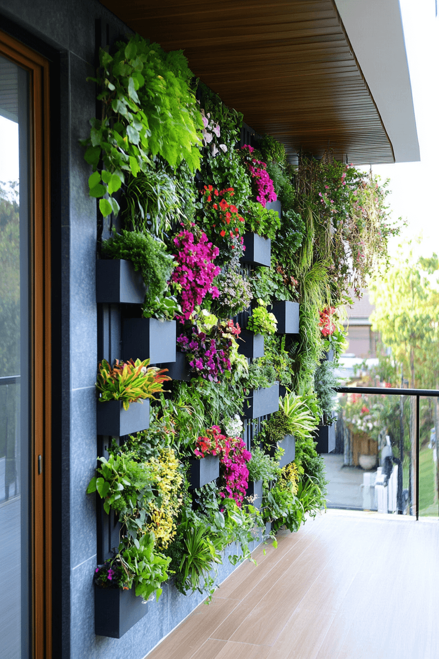 Sleek planters and vertical greenery create a modern plant-focused layout. Wall-mounted options save space while adding visual interest. These small balcony decor ideas combine style with smart use of space. Neutral containers keep the design cohesive. Minimal seating maintains openness. Plants become the focal point. The vibe feels fresh, organized, and vibrant. Tap to create a plant-inspired balcony.