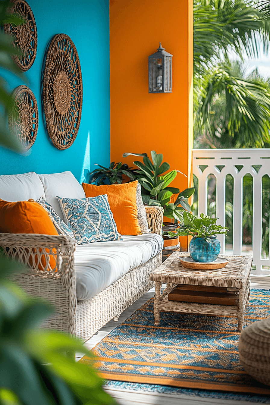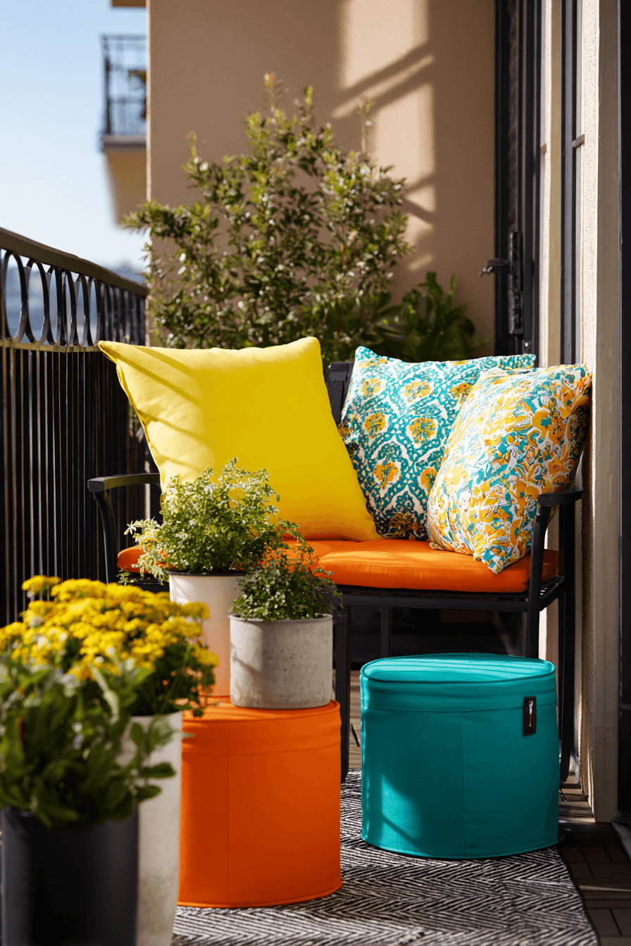 Bold accents and simple seating bring energy and personality into a compact layout. Pops of color add vibrancy without overwhelming the space. These small balcony decor ideas balance fun with functionality. Durable materials keep everything practical. A small table adds convenience. The layout remains clean and adaptable. The mood feels lively, modern, and stylish. Click to design your vibrant outdoor spot.