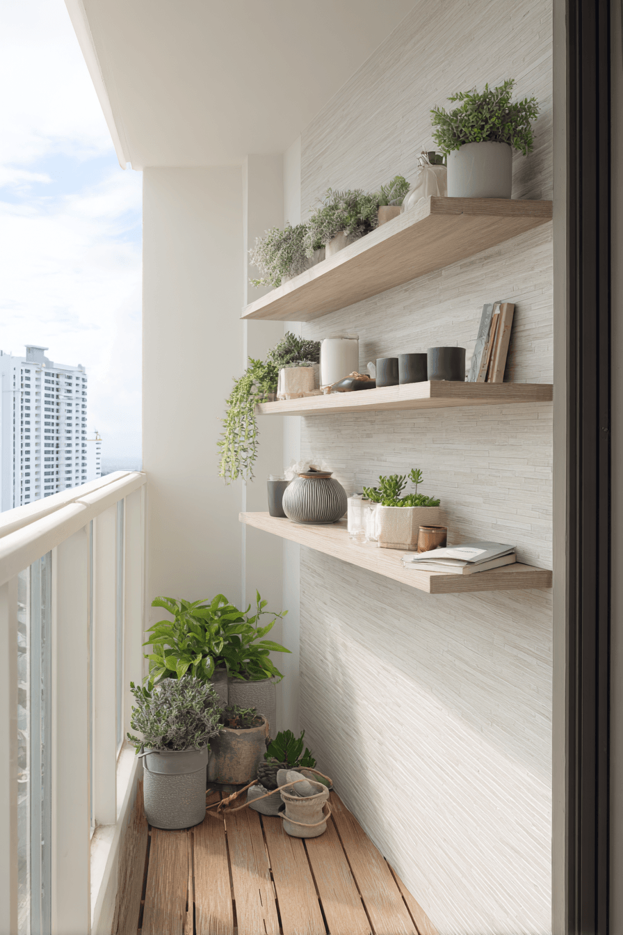 Wall-mounted storage keeps the balcony organized while freeing up floor space. Shelving adds both function and decorative opportunities. These small balcony decor ideas maximize vertical space efficiently. Clean lines maintain a modern appearance. Even narrow walls become useful features. Everything stays within reach yet uncluttered. The vibe feels practical, neat, and stylish. Explore smart storage solutions now.
