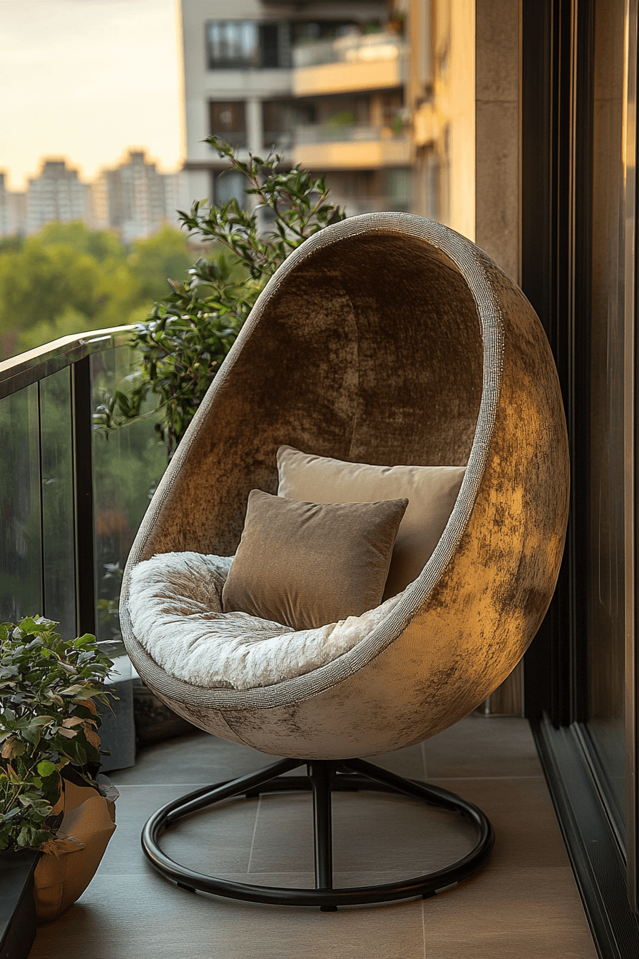 Luxe materials and plush details turn a small balcony into an elevated retreat. Rich textures add depth without overcrowding. These small balcony decor ideas maximize sophistication in tight spaces. Warm lighting enhances the elegant feel. A small table adds both style and function. The layout stays simple to highlight details. The vibe feels refined and inviting. Tap to create your luxe escape.