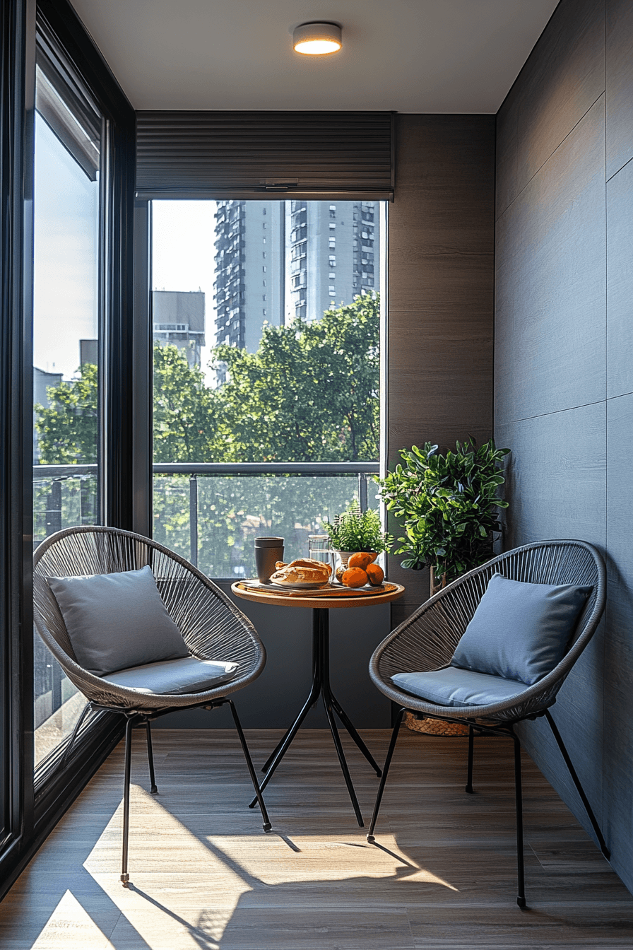 A refined corner setup proves that even the smallest balcony can feel polished and stylish. A compact bistro table paired with sleek seating creates a balanced and functional arrangement. These small balcony decor ideas shine by blending elegance with space efficiency. Smooth finishes and metallic touches elevate the look without excess. A small decorative element adds personality while keeping things clean. The layout remains flexible for everyday use. The vibe feels chic, modern, and effortless. Click to style your own elegant corner.