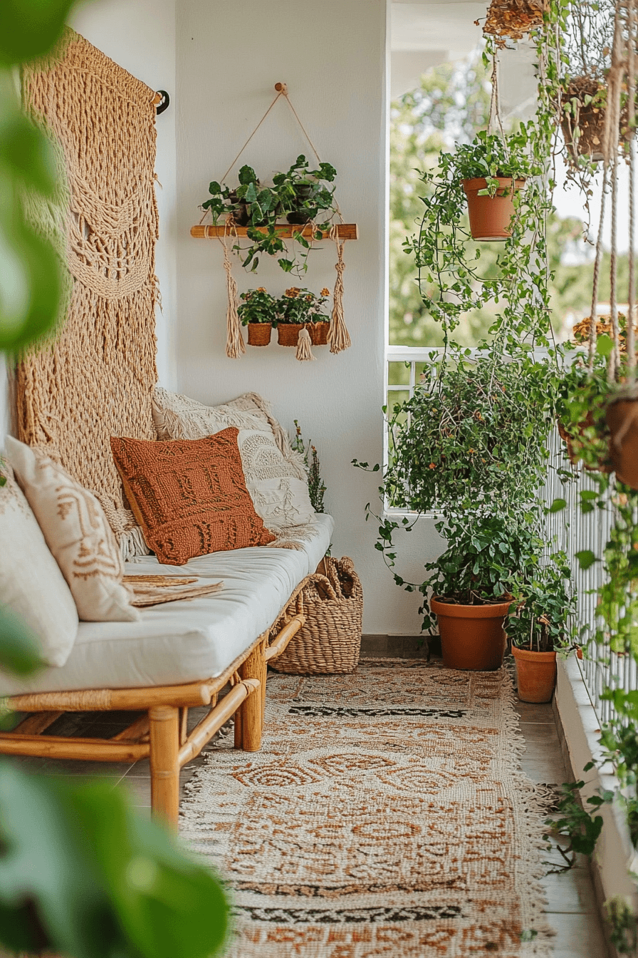 Boho layers bring warmth and personality through textiles, plants, and earthy tones that feel expressive yet relaxed. Woven details, patterned cushions, and soft rugs create depth in a compact layout. These small balcony decor ideas focus on texture to make the space visually rich. Natural materials like jute and cotton enhance the organic feel. Hanging greenery draws the eye upward and frees up floor space. The seating remains comfortable and adaptable. The mood feels cozy, creative, and free-spirited. Tap to embrace a boho-inspired outdoor space.