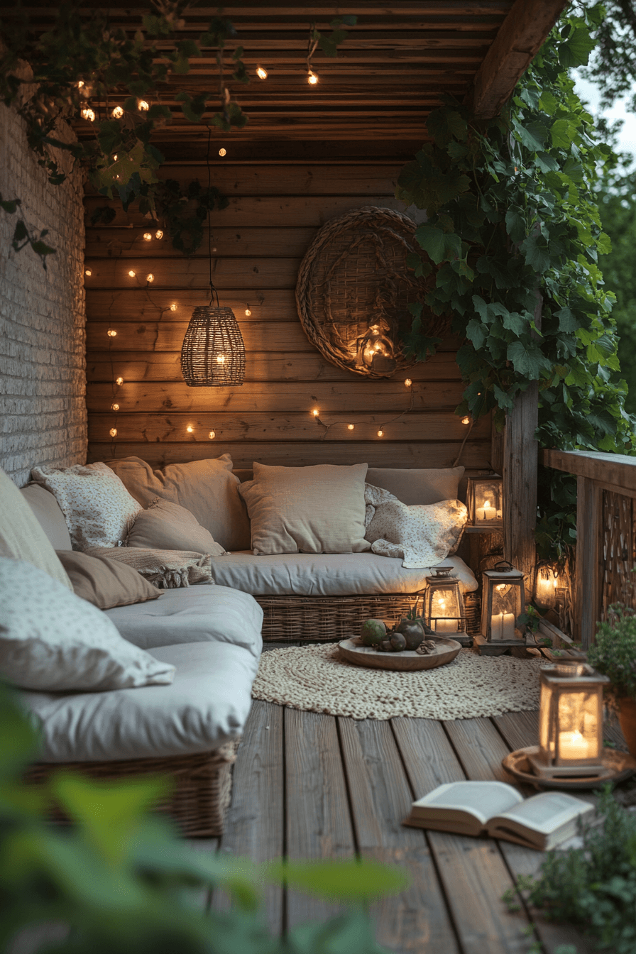 Soft lighting and layered textures create an intimate, cozy outdoor nook. Cushions and throws add comfort without overwhelming the space. These small balcony decor ideas blend softness with style. Neutral tones keep the design cohesive. Lighting enhances the overall mood beautifully. Even a small setup feels luxurious. The mood feels romantic, warm, and serene. Click to design your dreamy retreat.