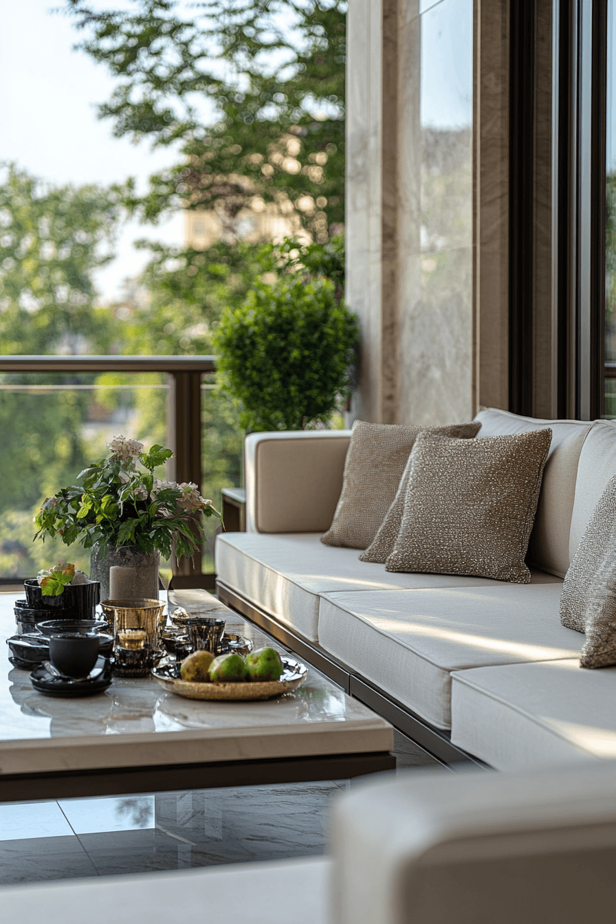 Elegant details bring a sense of luxury into this compact outdoor space without overwhelming it. A delicate table and refined finishes act as subtle focal points. These small balcony decor ideas prove that scale and style can work together beautifully. Neutral shades with metallic hints add a polished touch. Soft lighting enhances the upscale feel. Minimal decor keeps everything balanced. The atmosphere feels refined, calm, and inviting. Explore how to elevate your balcony with ease.