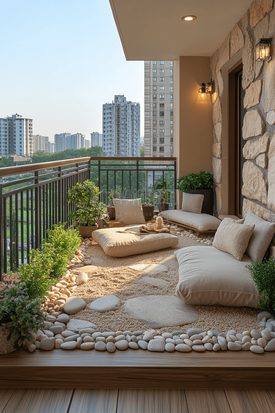 A Zen-inspired layout introduces calm through natural textures, soft greenery, and open space. Stone accents and simple arrangements enhance the peaceful atmosphere. These small balcony decor ideas prioritize balance and quiet design. Minimal elements ensure the space stays uncluttered and grounded. Subtle textures bring depth without distraction. Soft lighting extends the tranquil feel into the evening. The vibe feels restful, calm, and centered. Tap to create your serene outdoor escape.