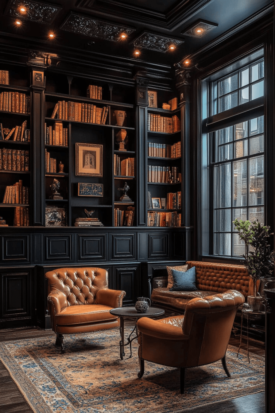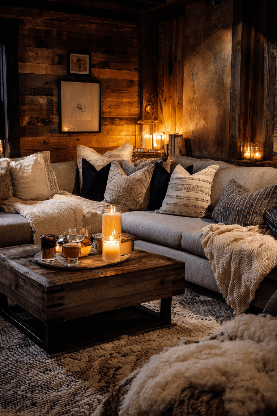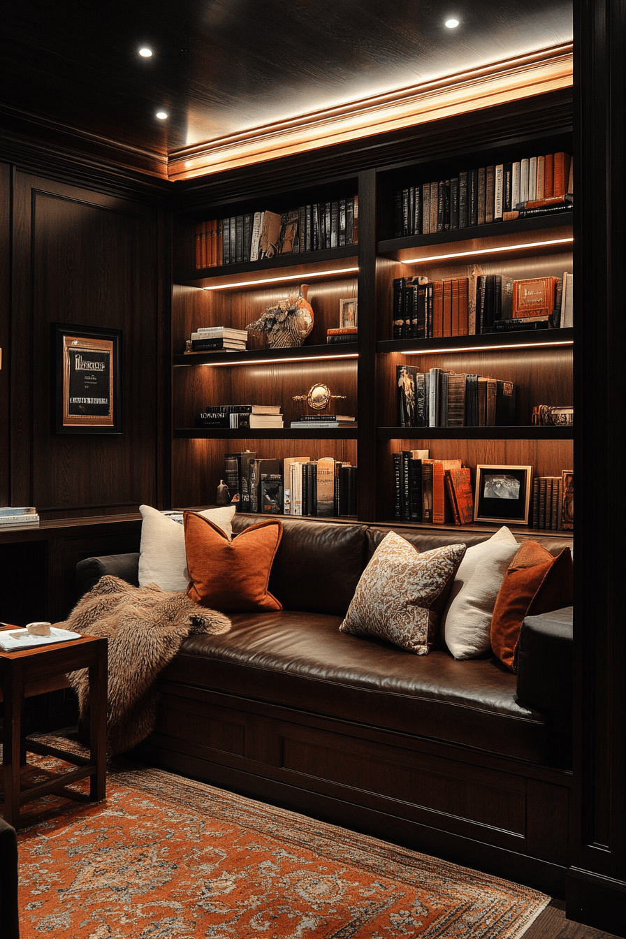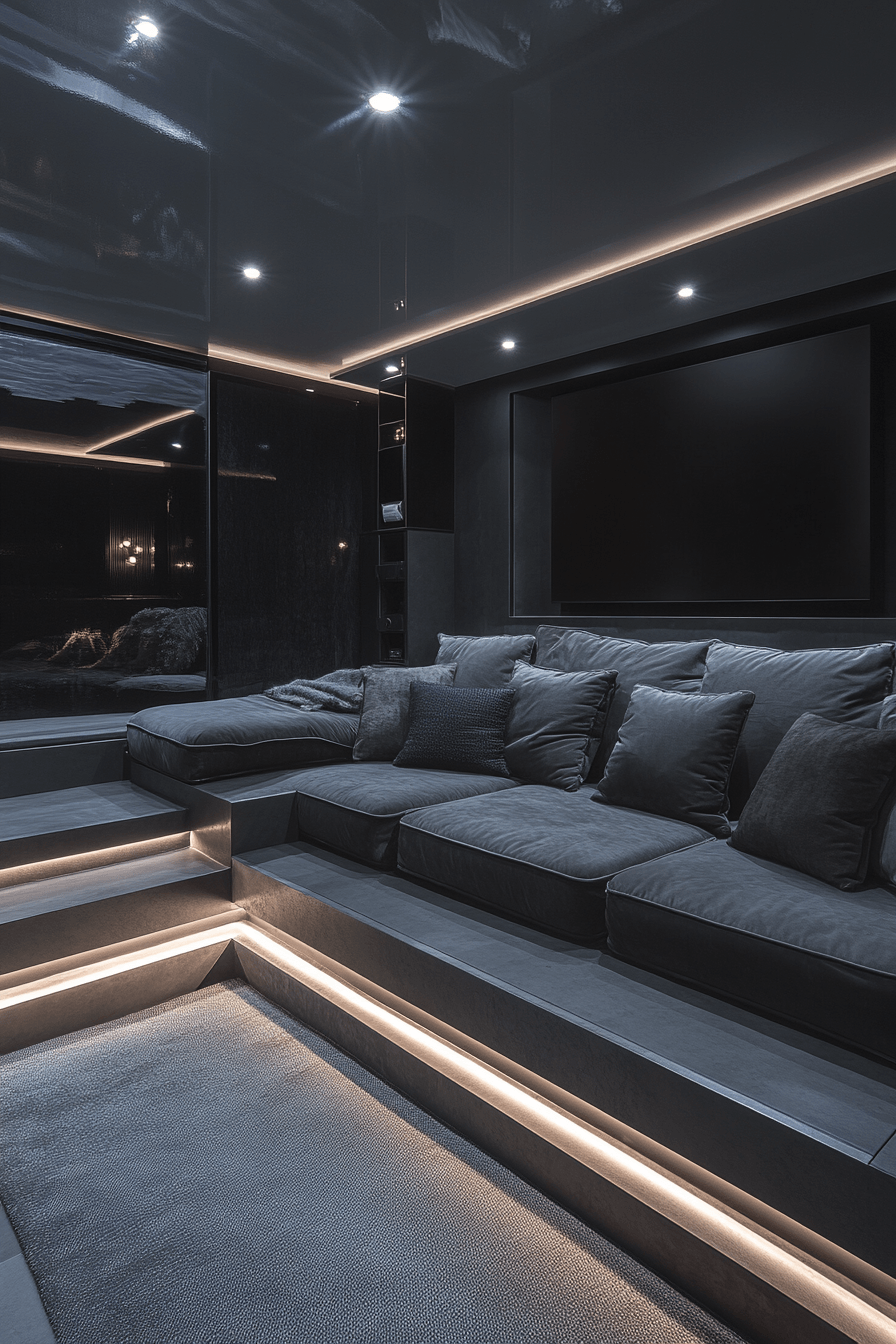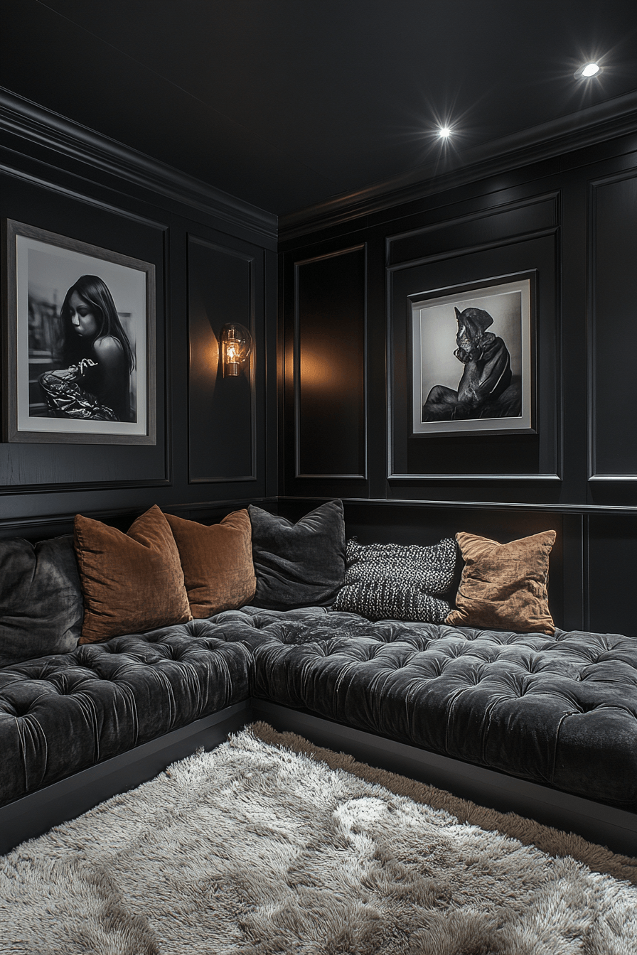 Deep tones and layered lighting can completely reshape a basement into a refined, intimate space. This small basement ideas approach uses rich colors and soft illumination to create depth and focus. Low-profile seating keeps the layout grounded while maintaining comfort. Textured fabrics add warmth against darker finishes. Subtle reflective accents prevent the room from feeling closed in. The overall mood feels calm and elevated. Bring this moody transformation into your space.