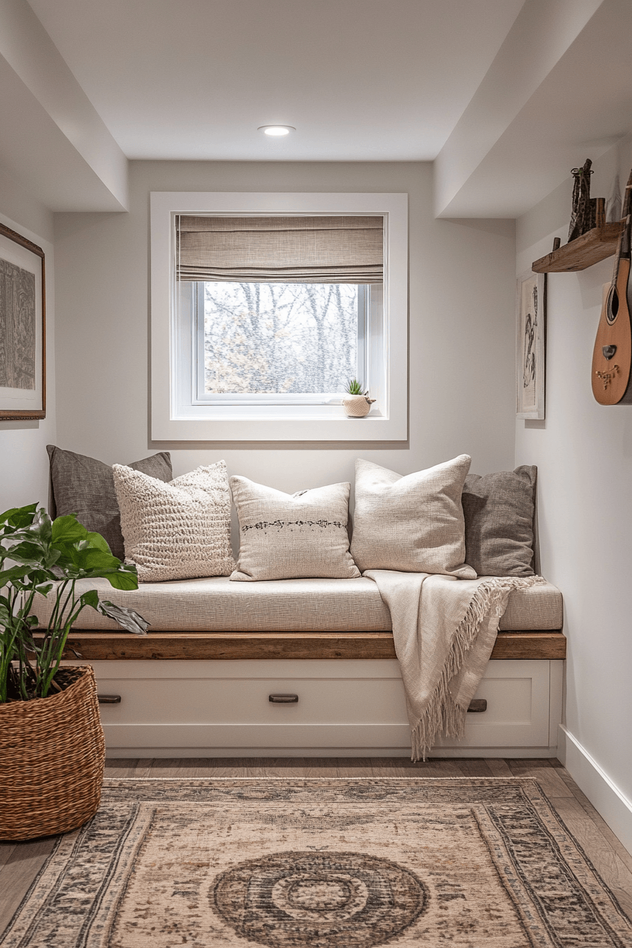 Layered decor can give a basement a relaxed and creative atmosphere. This small basement ideas concept uses patterns and textures for visual interest. Balanced layouts prevent the space from feeling crowded. Soft lighting enhances the mood. Natural tones keep everything cohesive. The vibe feels artistic and welcoming. Design a space full of personality.