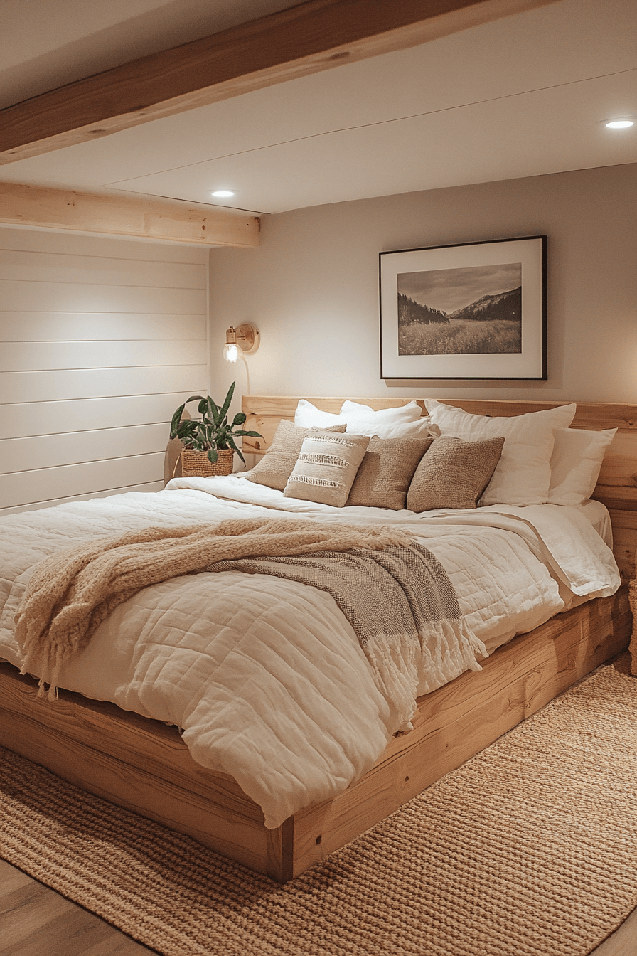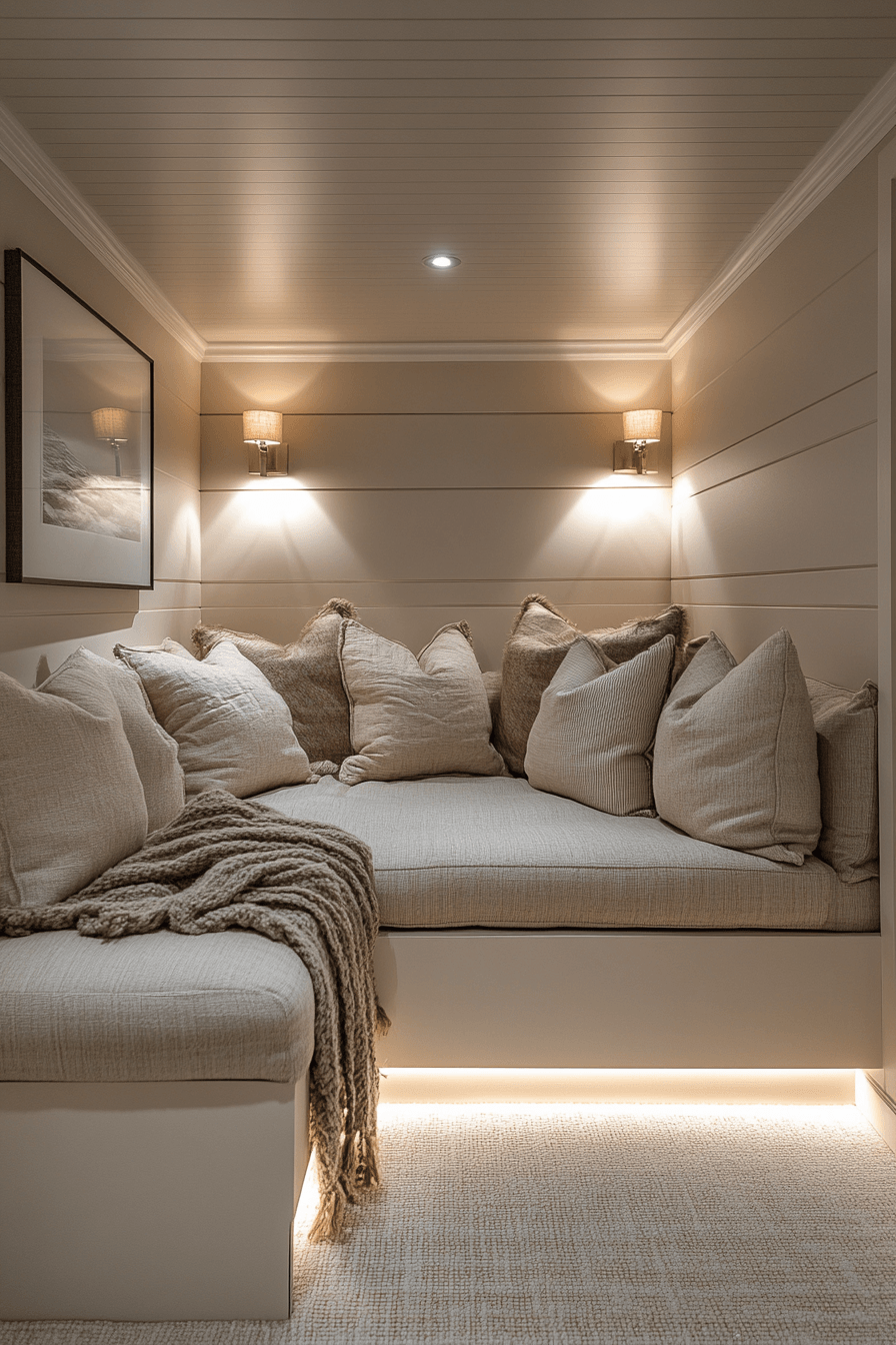 Warm textures and low lighting can create a deeply cozy basement retreat. This small basement ideas style focuses on comfort and softness. Plush seating enhances relaxation. Natural materials add depth and warmth. Minimal decor keeps everything grounded. The space feels snug and inviting. Create a space you’ll love to unwind in.