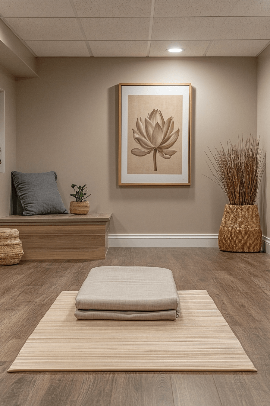 A wellness-focused area can turn a basement into a calming retreat. This small basement ideas setup emphasizes open space and simplicity. Soft tones create a peaceful environment. Natural textures add warmth. Minimal decor supports relaxation. The atmosphere feels balanced and refreshing. Create your own wellness space.