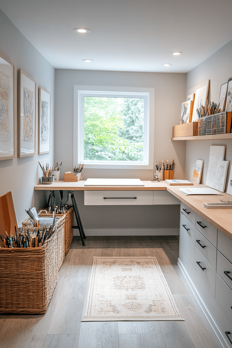 Creative setups can turn a basement into a productive workspace. This small basement ideas concept focuses on flexibility and organization. Open layouts allow movement. Neutral tones keep the design clean. Storage solutions maintain order. The space feels inspiring and functional. Build a space for creativity.