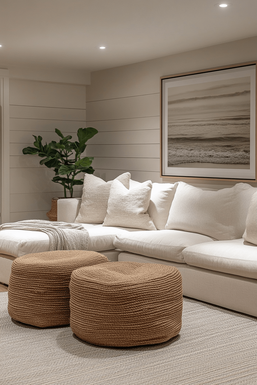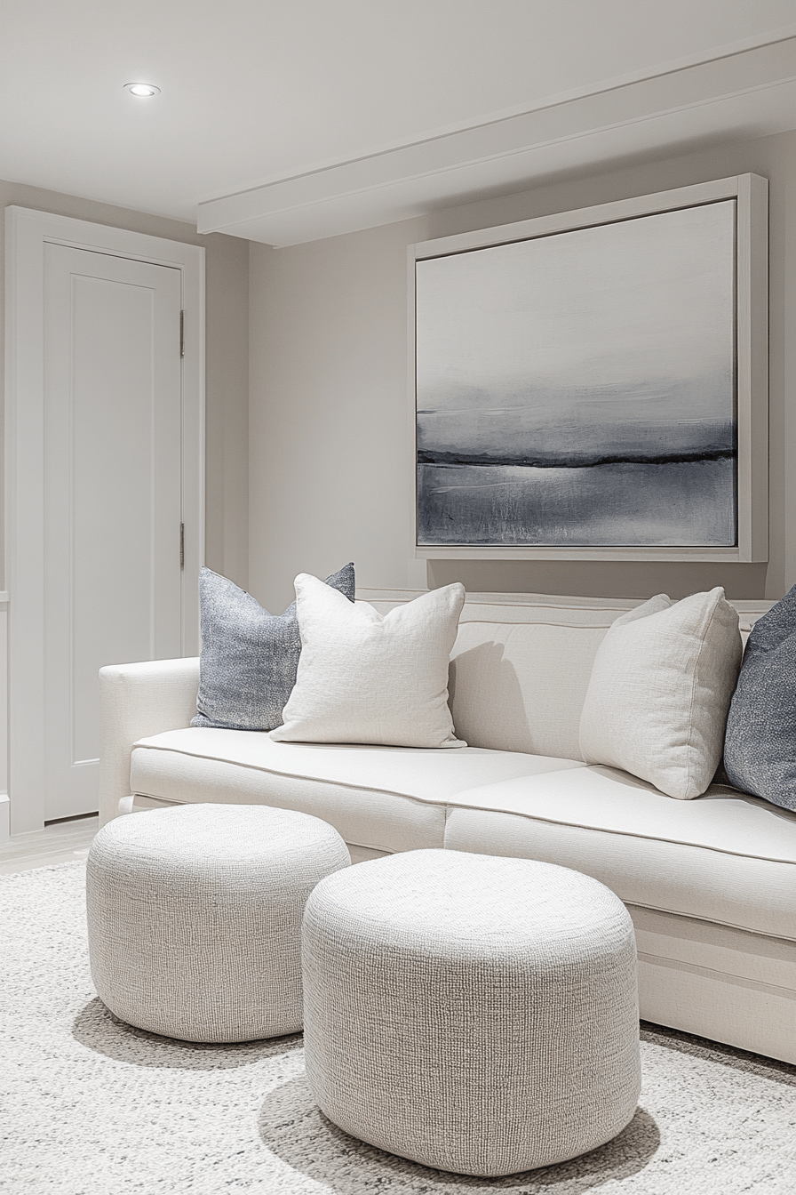 Soft tones and natural textures can bring a light and airy feel into a basement. This small basement ideas approach focuses on brightness to counteract the lack of windows. Simple furniture keeps the layout open. Subtle decor adds personality without clutter. Light fabrics enhance comfort. The space feels refreshing and easygoing. Bring a breezy feel into your basement.