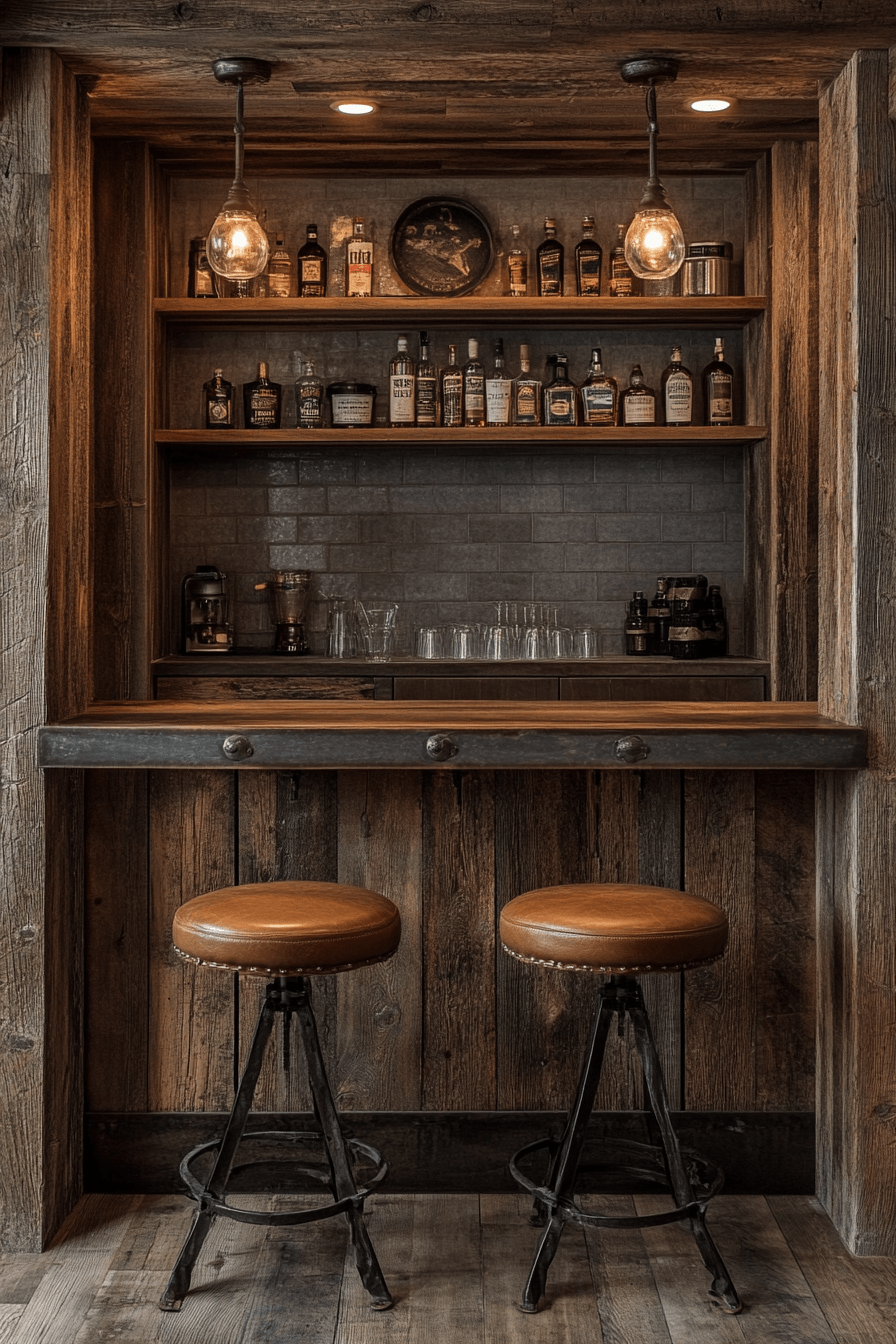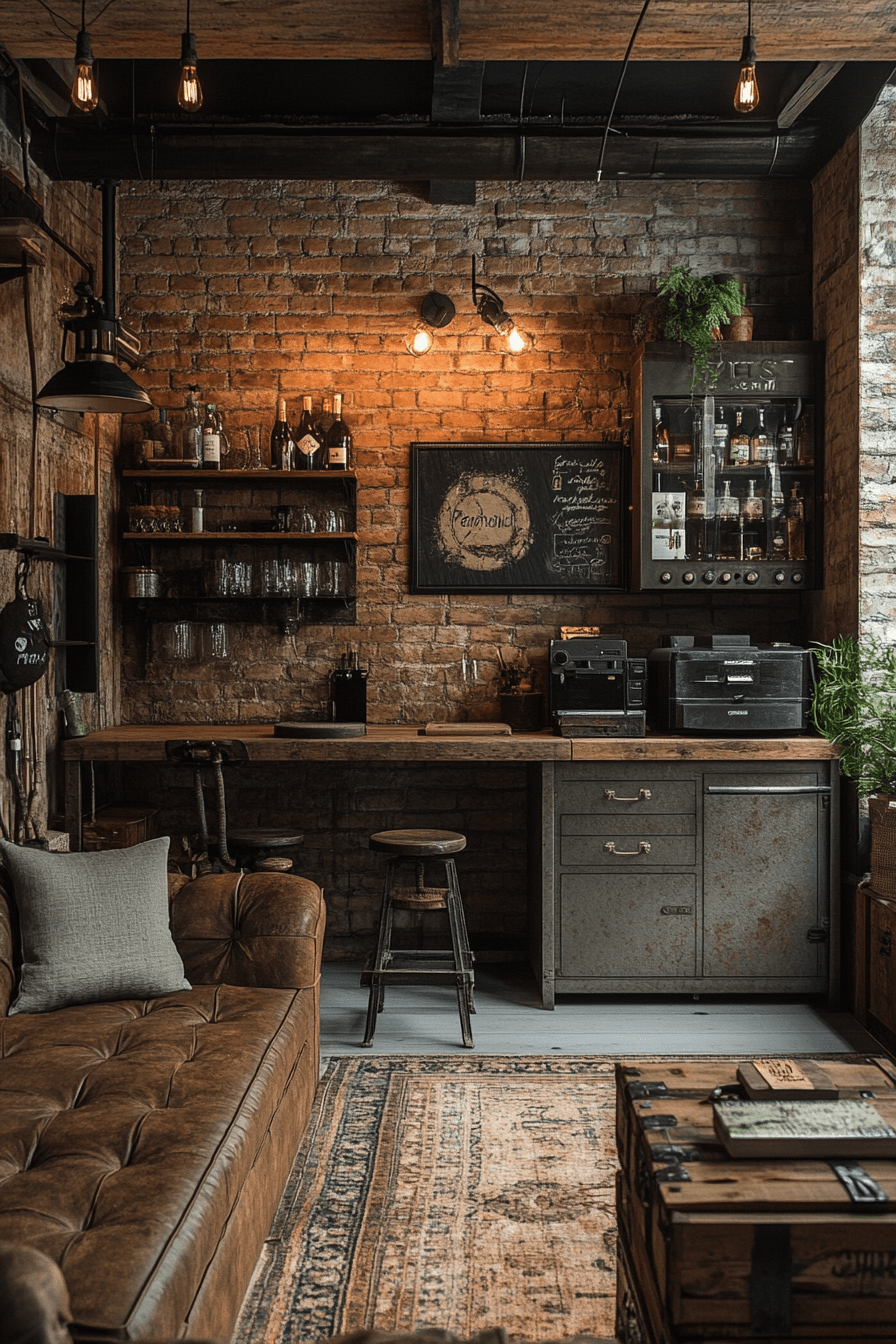 A compact bar setup can bring personality and function into a basement corner. This small basement ideas concept uses rich materials and warm lighting to create atmosphere. Wood tones and metal accents add depth and character. Simple layouts keep the area practical without overcrowding. Seating is kept minimal to maintain flow. The vibe feels intimate and stylish. Turn your basement into a social hub.