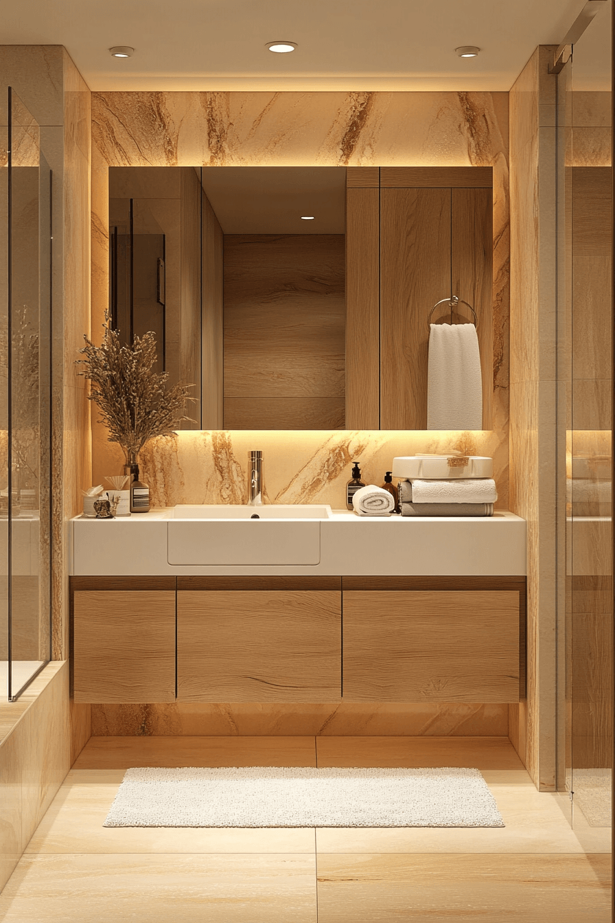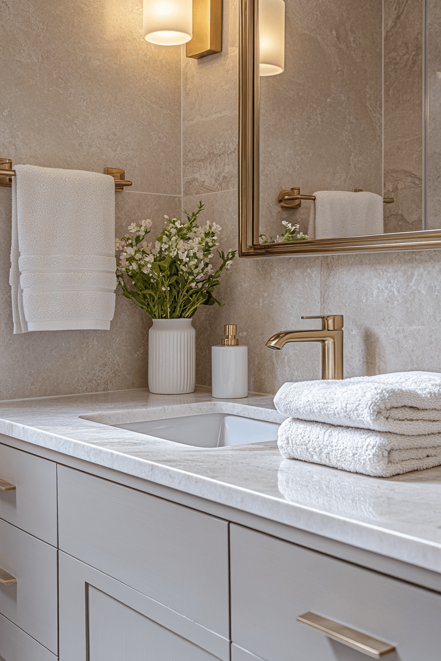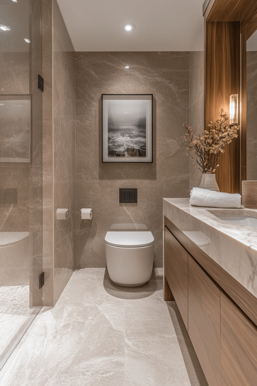 This compact luxury setup shows how small guest bathroom ideas can still feel upscale and thoughtfully designed. Smooth stone finishes, a floating vanity, and subtle gold touches bring a refined, high-end feel into the space. Soft layered lighting reflects off polished surfaces, helping the room appear brighter and more open. A palette of warm neutrals, creamy taupes, and soft ivory tones creates a welcoming atmosphere. Every detail feels intentional, from sleek fixtures to neatly styled countertop accents. See how to recreate this elevated look in your own space!