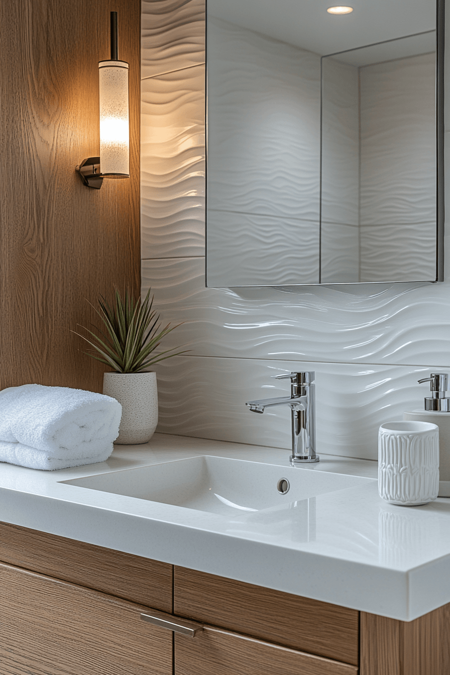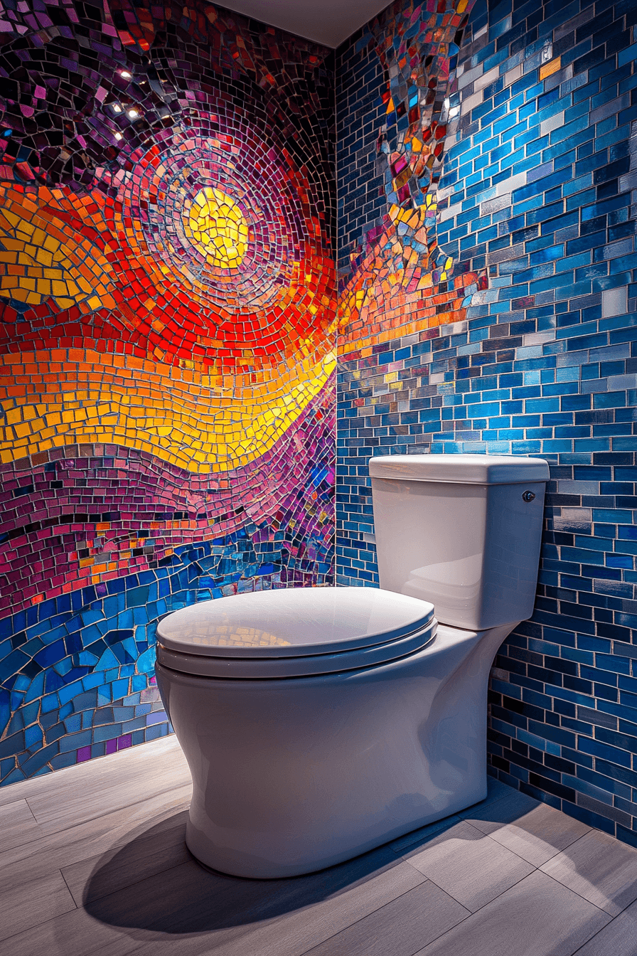 Mosaic details add personality to small guest bathroom ideas with texture and visual movement. Small-scale patterns work well in compact spaces without overpowering them. Bright lighting highlights the intricate design. Balanced styling keeps the look cohesive. The space feels lively and unique. Add mosaic for a creative touch!
