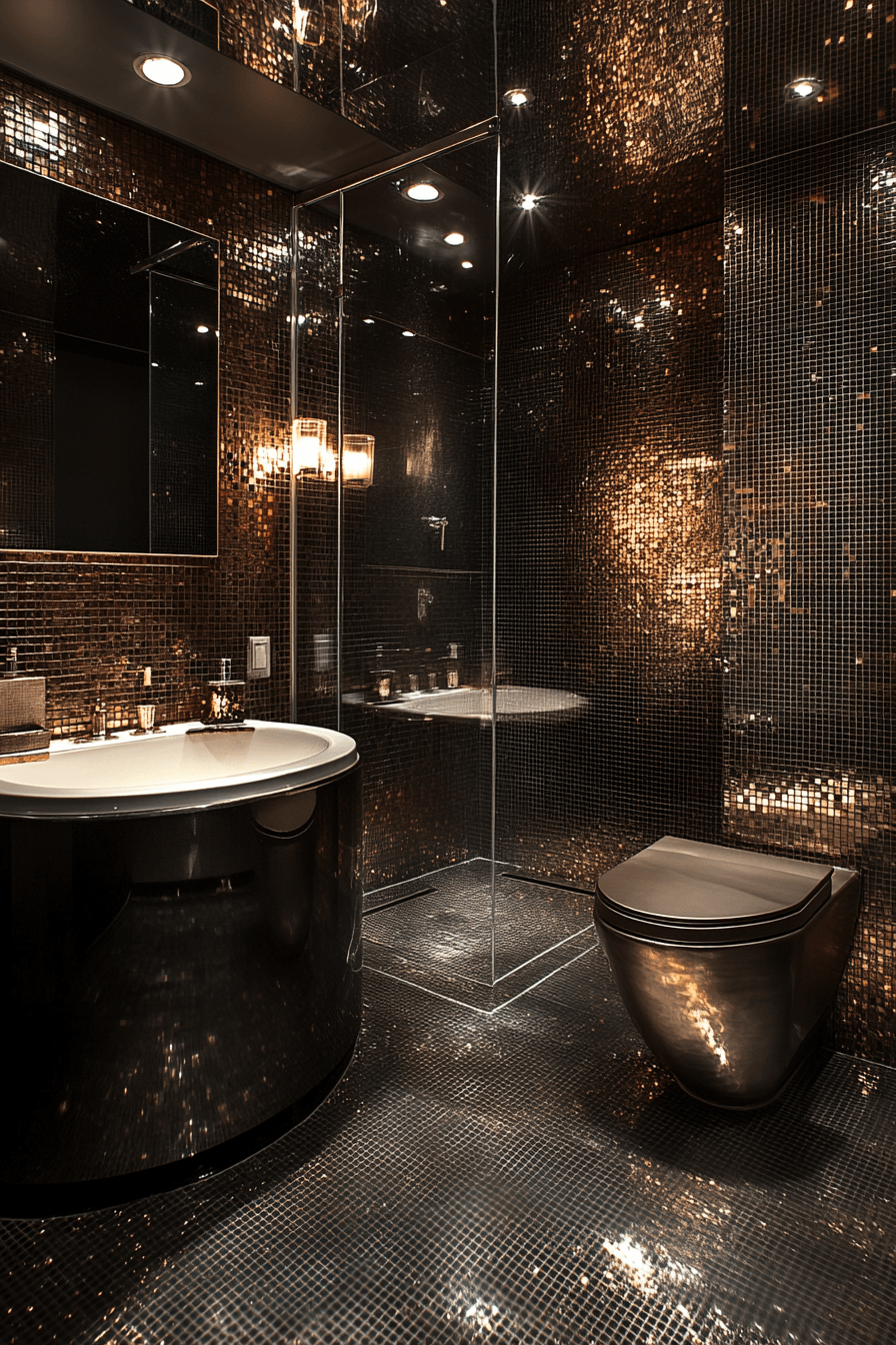 Glossy finishes create a modern edge in small guest bathroom ideas with a polished, city-inspired look. Reflective surfaces brighten the room while making it feel more spacious. Dark accents add contrast and sophistication. Lighting highlights the shine and keeps the space from feeling heavy. The overall effect is sleek and stylish. Try this approach for a bold, modern update!