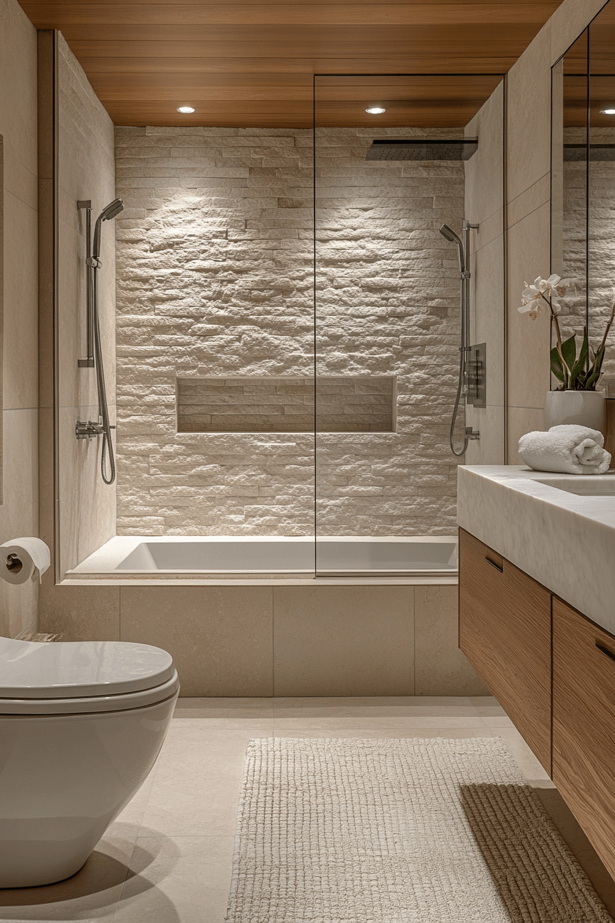 15. Warm Textured Bathroom Hideaway