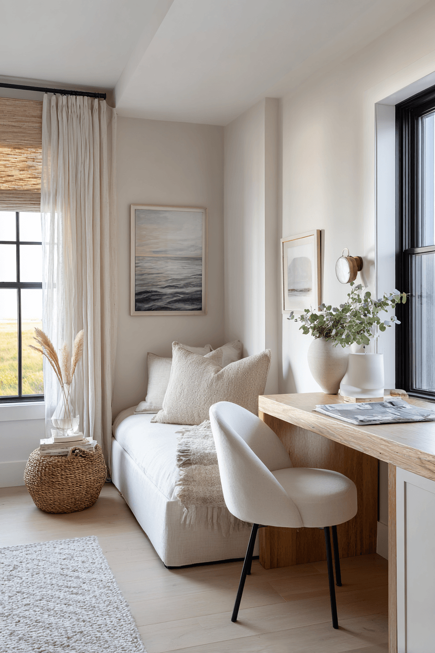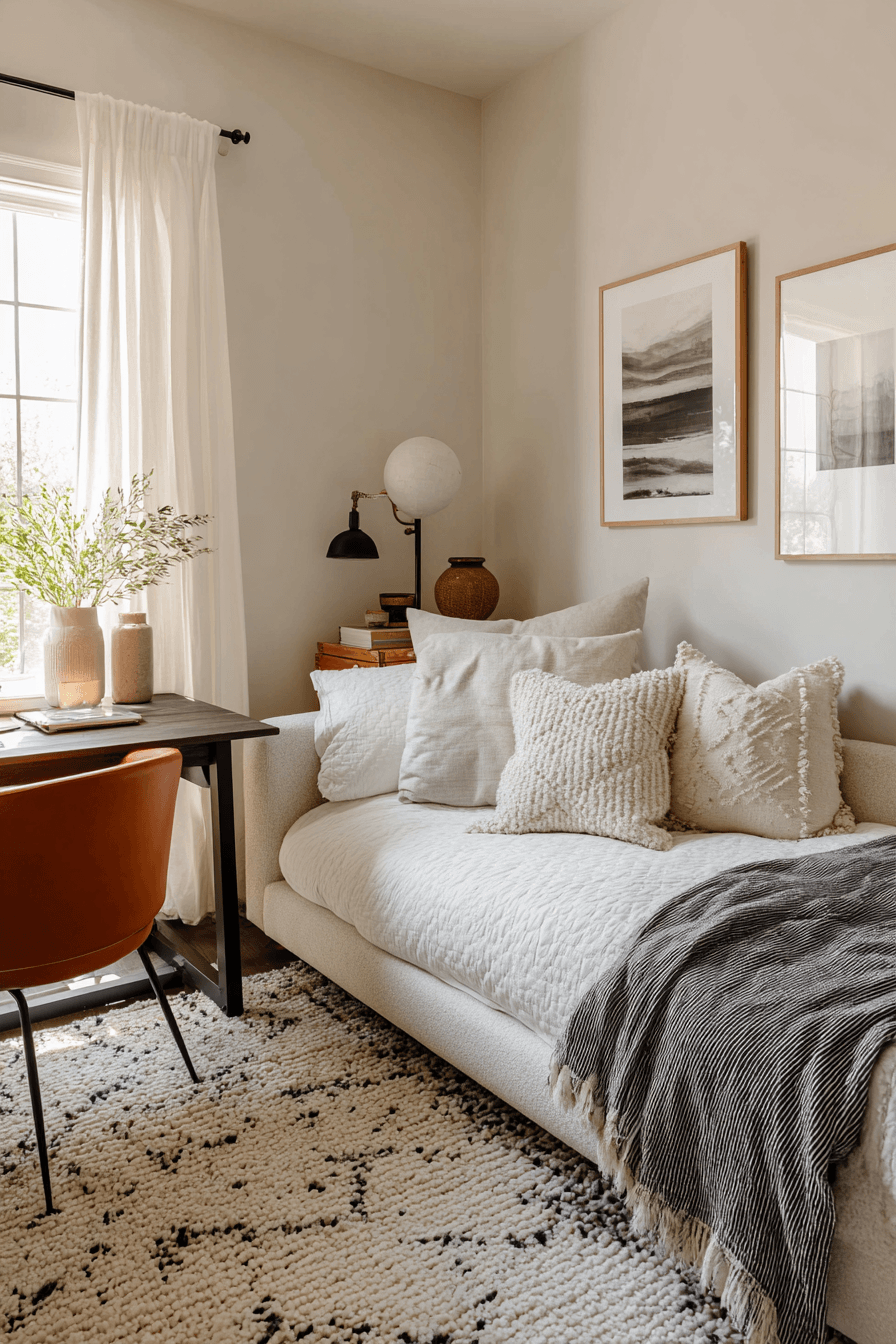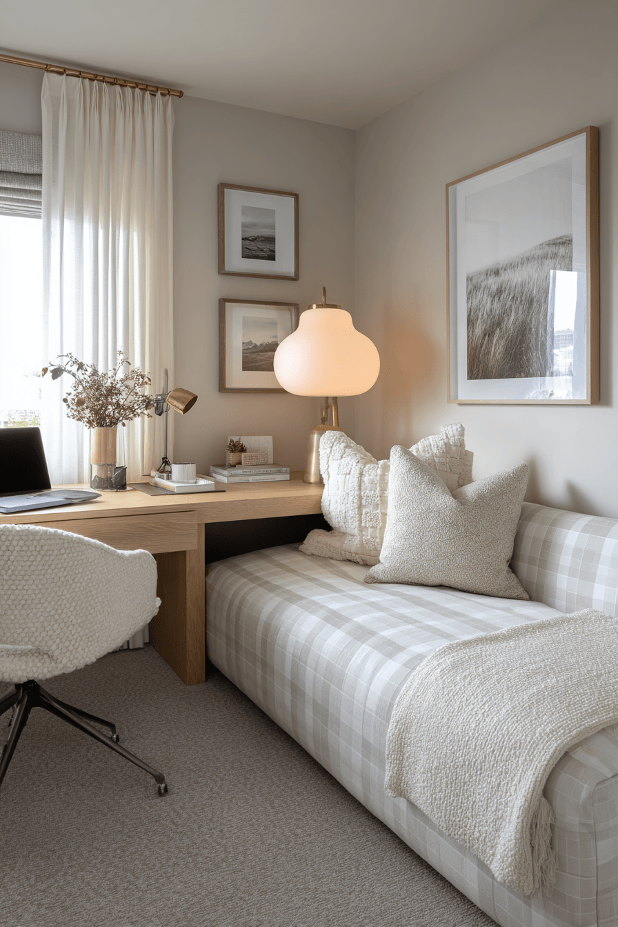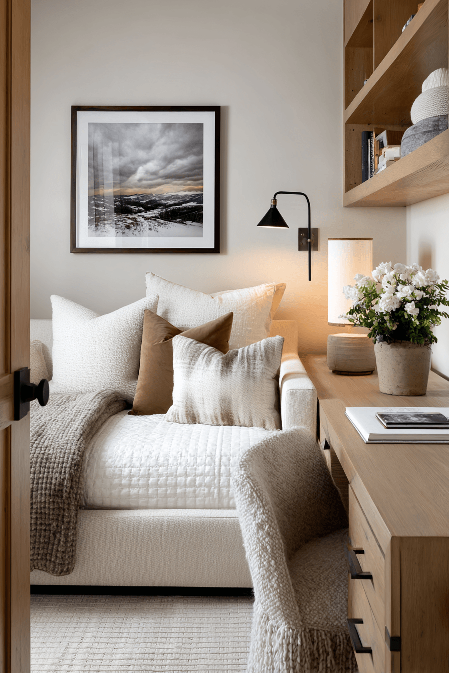 A peaceful setup shapes this small home office guest room into a calm and focused sanctuary. Soft neutral tones and gentle lighting reduce distractions while enhancing comfort. A compact desk and cozy sleeping area ensure versatility. Natural textures like wood and linen add warmth and balance. The space feels quiet, intentional, and highly functional. Every detail supports relaxation and productivity. Step into this serene workspace style!