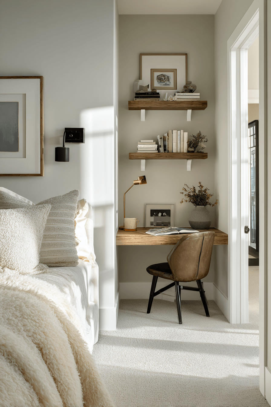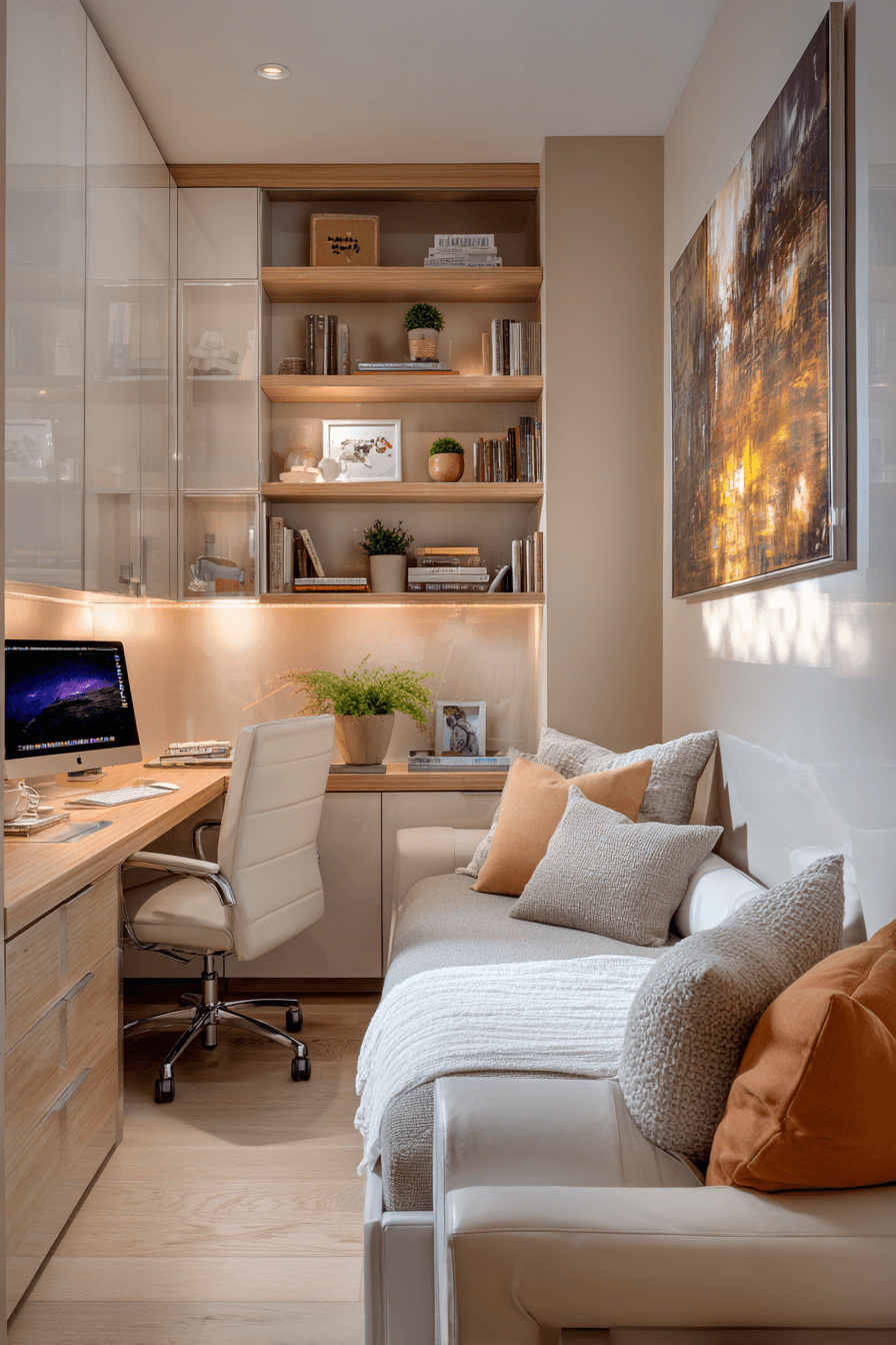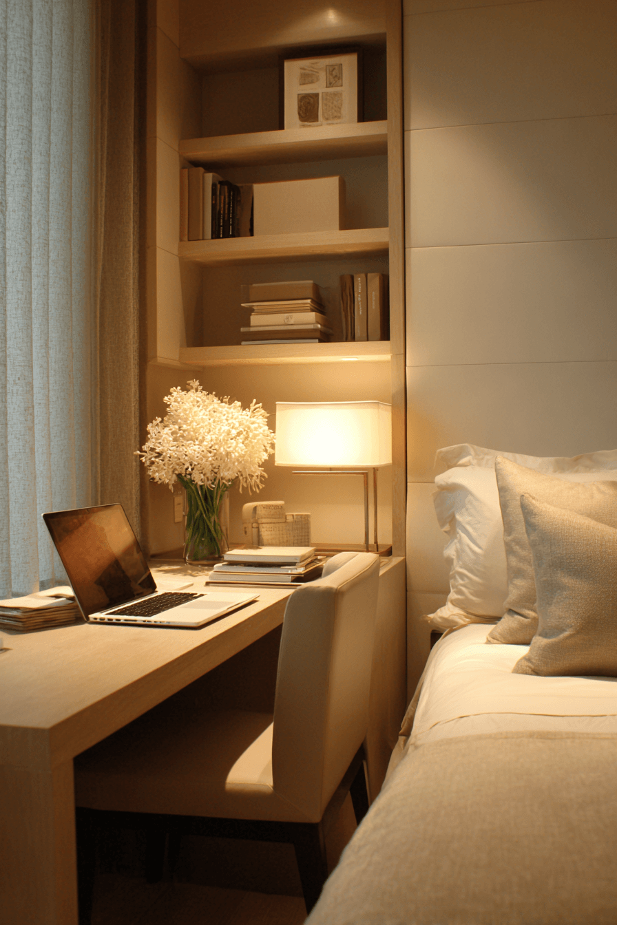 A peaceful setup shapes this small home office guest room into a calm and focused sanctuary. Soft neutral tones and gentle lighting reduce distractions while enhancing comfort. A compact desk and cozy sleeping area ensure versatility. Natural textures like wood and linen add warmth and balance. The space feels quiet, intentional, and highly functional. Every detail supports relaxation and productivity. Step into this serene workspace style!