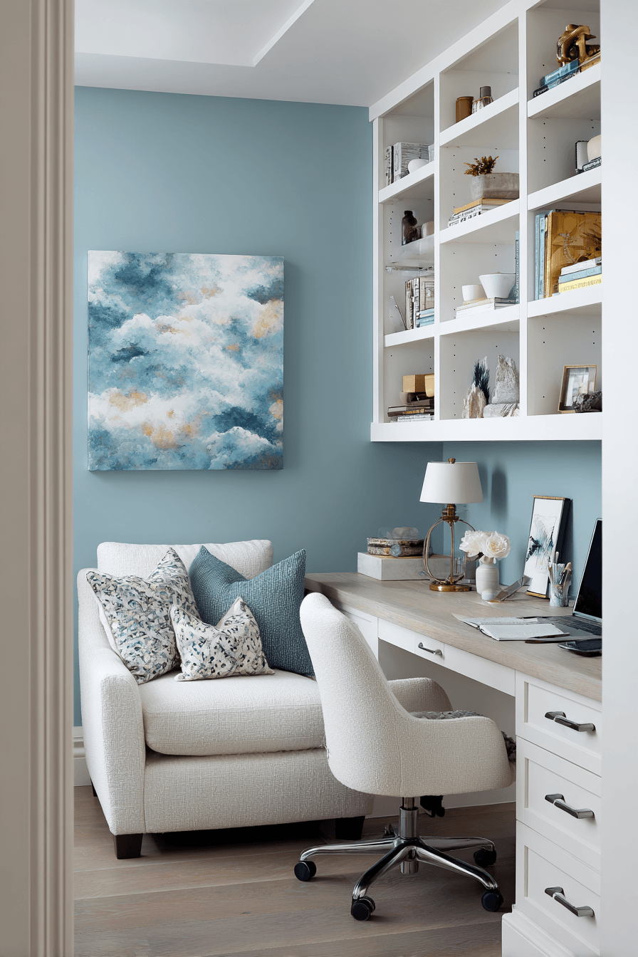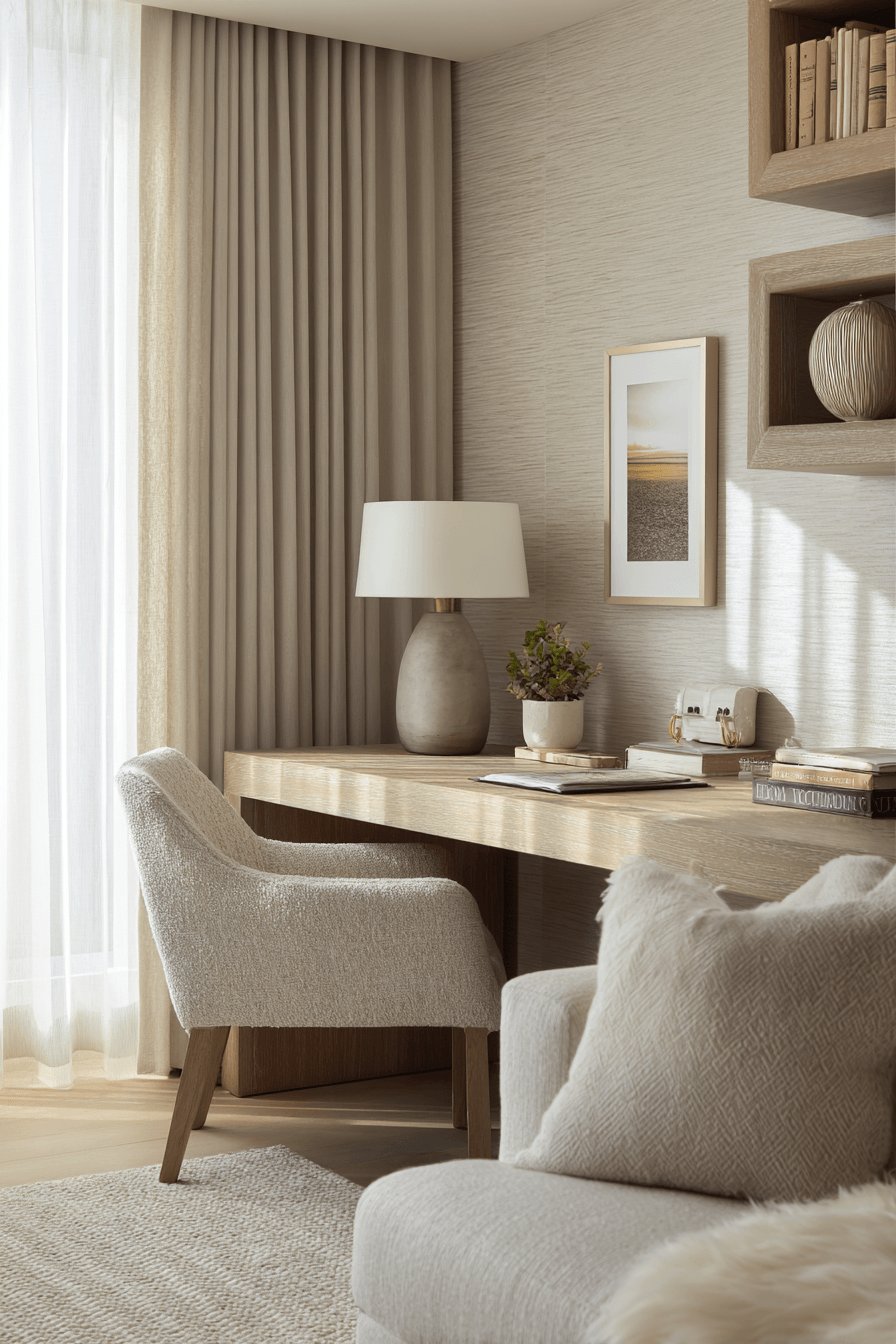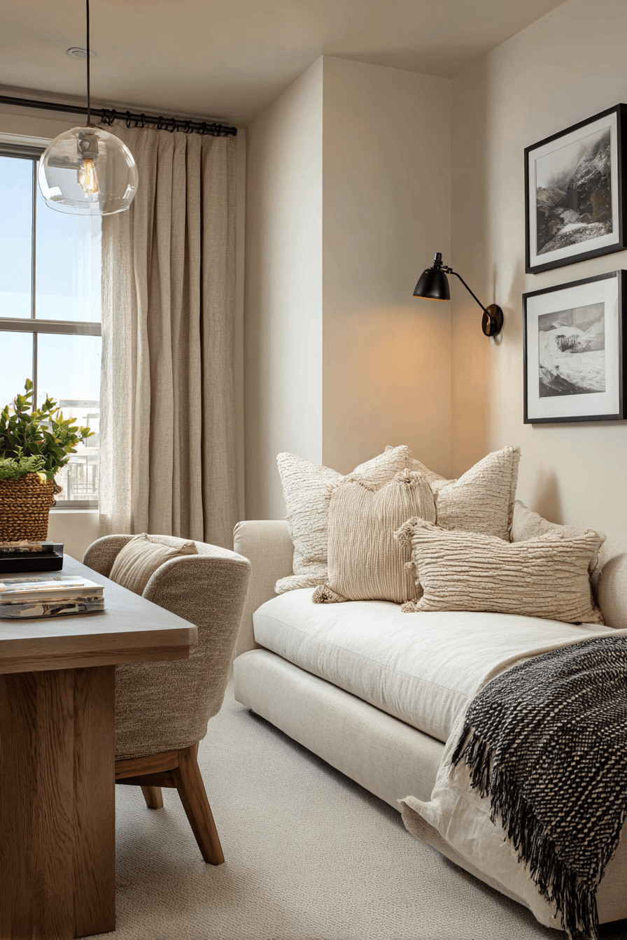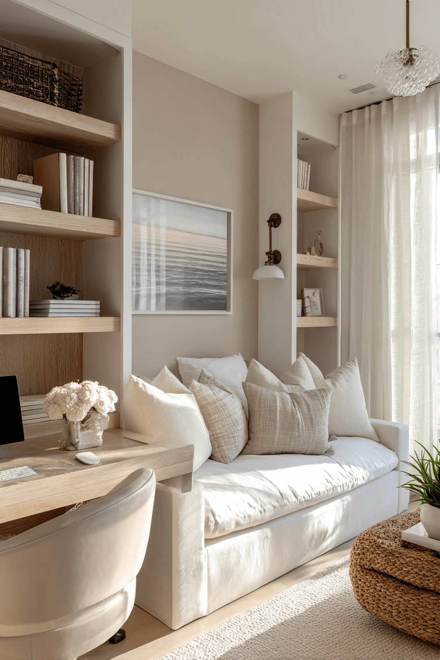 A peaceful setup shapes this small home office guest room into a calm and focused sanctuary. Soft neutral tones and gentle lighting reduce distractions while enhancing comfort. A compact desk and cozy sleeping area ensure versatility. Natural textures like wood and linen add warmth and balance. The space feels quiet, intentional, and highly functional. Every detail supports relaxation and productivity. Step into this serene workspace style!