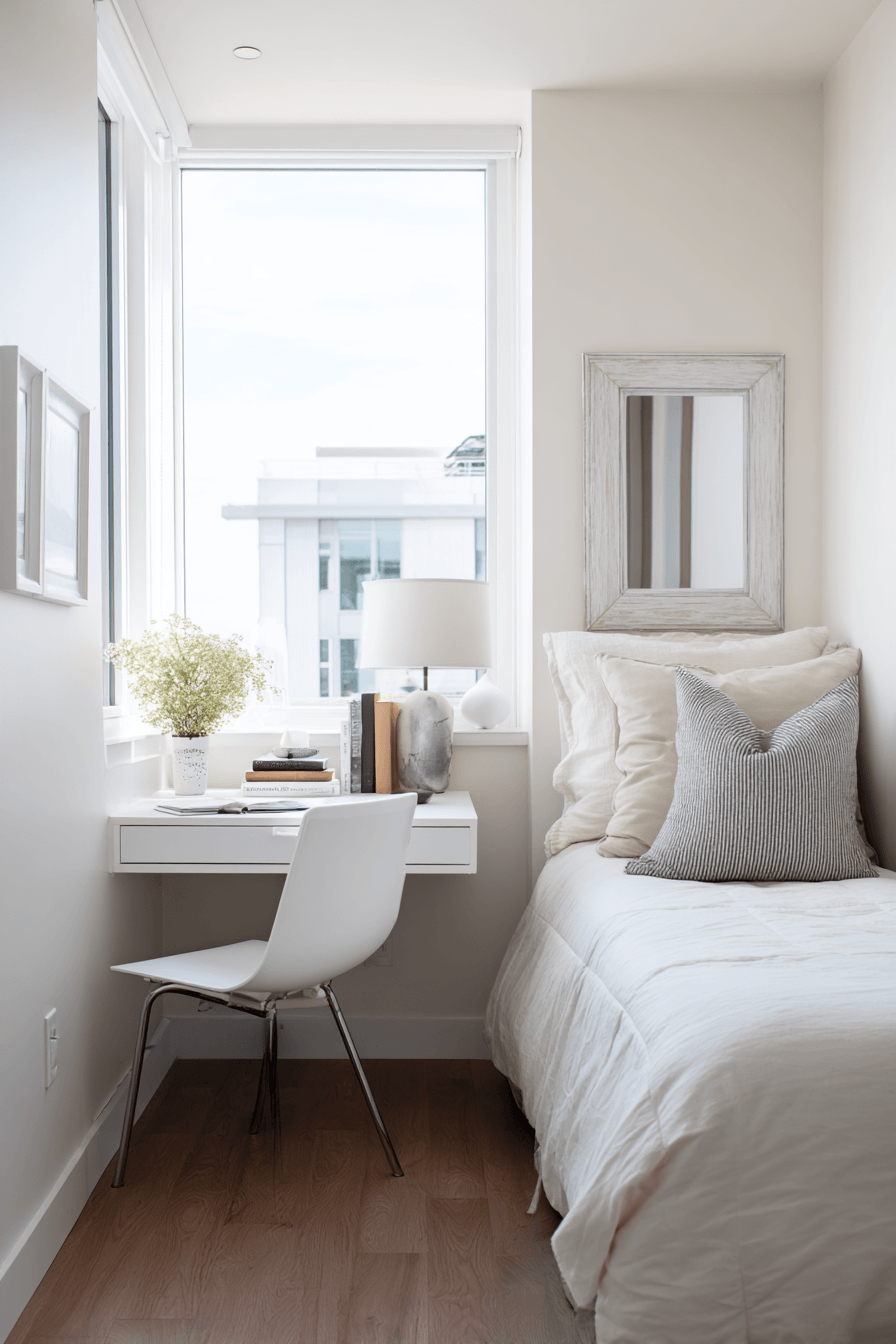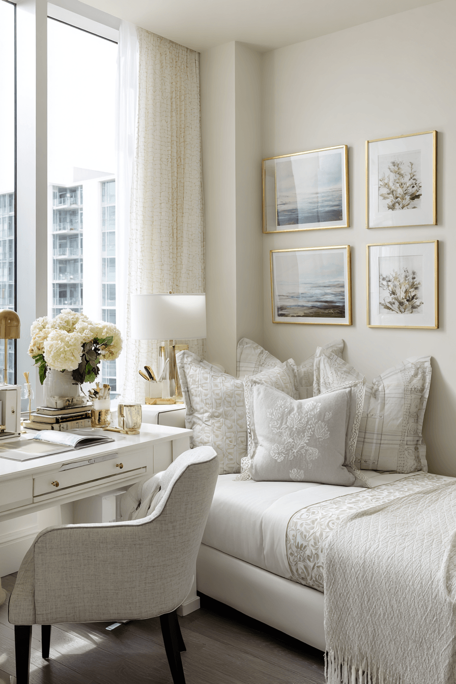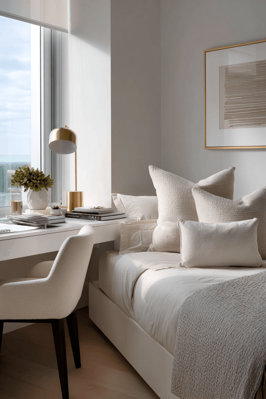 A chic corner layout brings both elegance and practicality into this small home office guest room. Soft textures and subtle patterns enhance the design beautifully. A compact workspace sits comfortably beside a cozy sleeping area. The light palette keeps everything open and airy. The space feels stylish without sacrificing function. It’s both inviting and efficient. Explore chic small-space ideas now!
