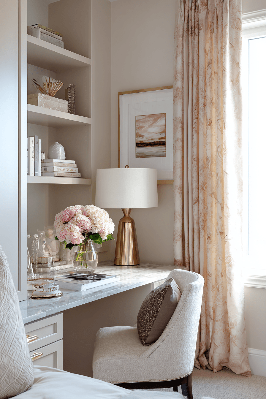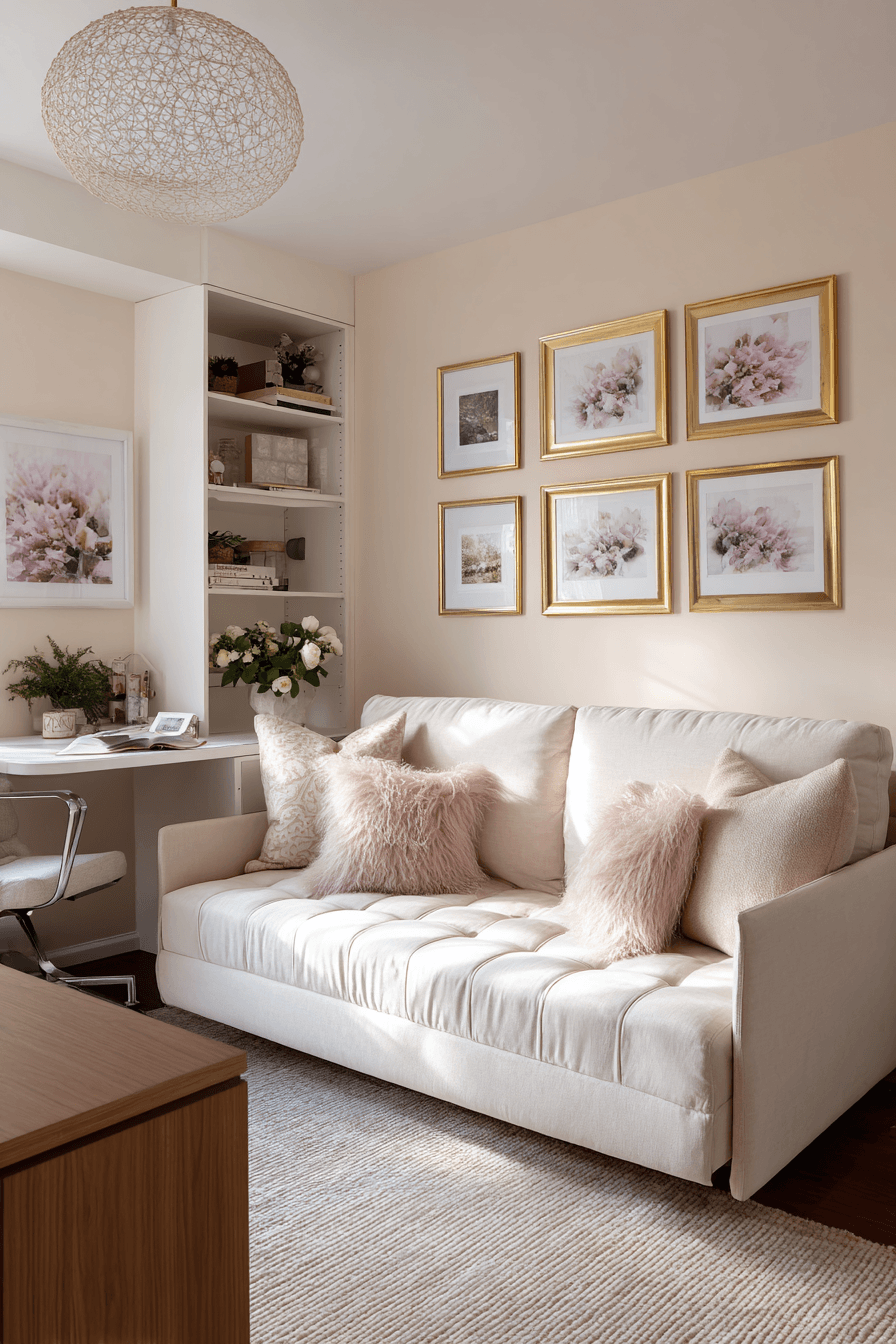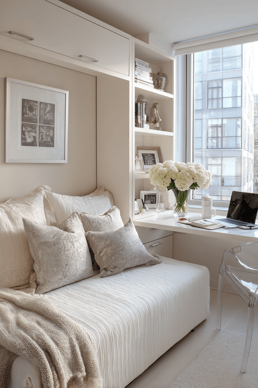 A chic corner layout brings both elegance and practicality into this small home office guest room. Soft textures and subtle patterns enhance the design beautifully. A compact workspace sits comfortably beside a cozy sleeping area. The light palette keeps everything open and airy. The space feels stylish without sacrificing function. It’s both inviting and efficient. Explore chic small-space ideas now!
