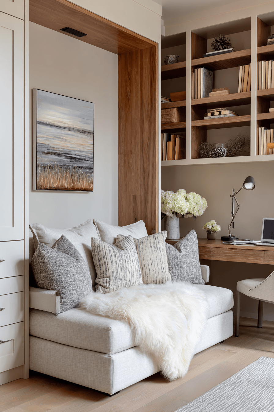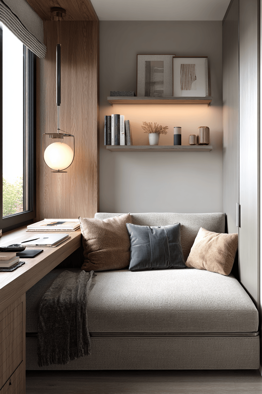 A flexible lounge-style approach transforms this small home office guest room into a comfortable and adaptable space. Seating doubles as a bed, maximizing usability. A sleek desk integrates smoothly into the layout. Warm tones and layered textures create a relaxed atmosphere. The room feels modern, cozy, and practical. It adapts easily to changing needs. Discover more adaptable room designs today!